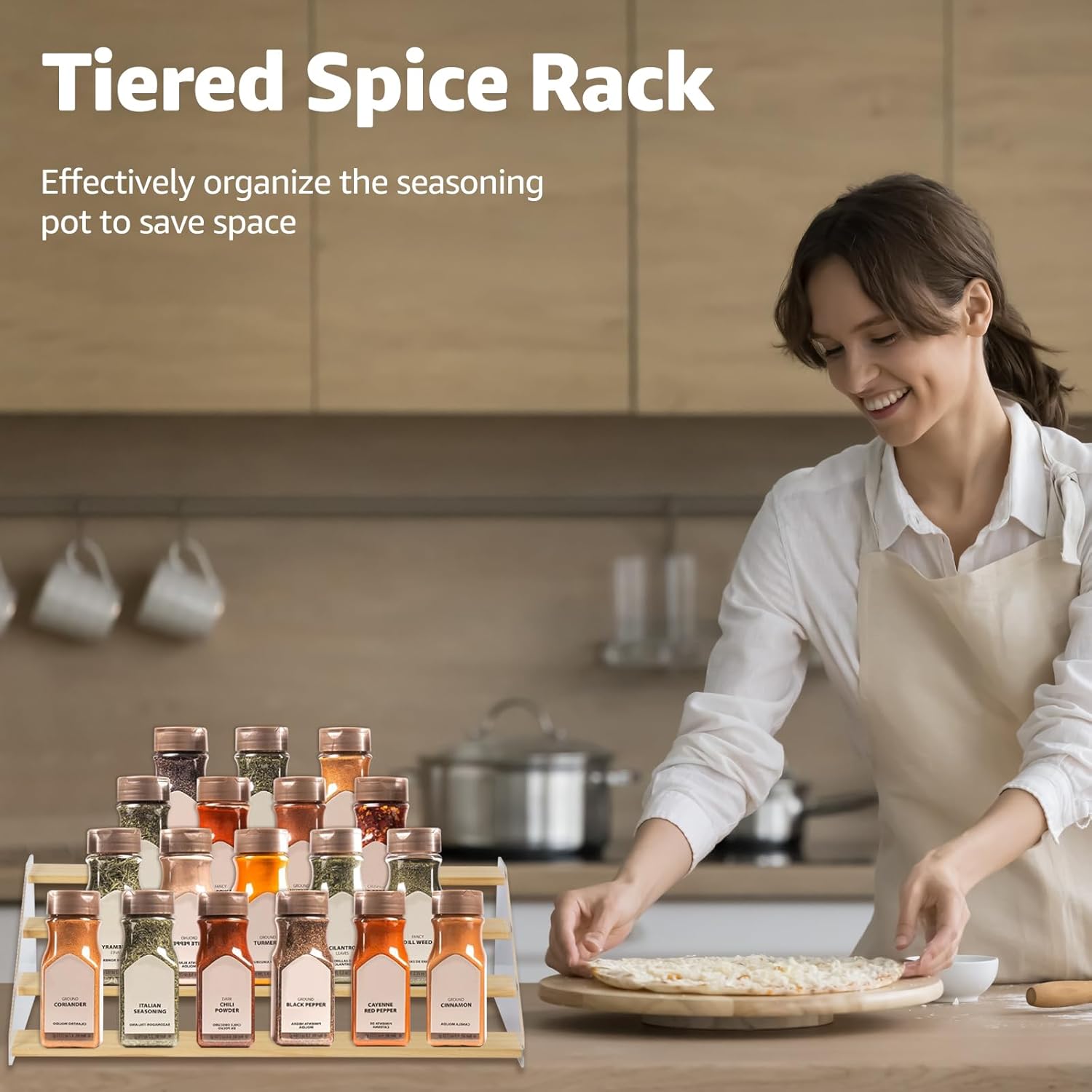 nianfeng Tiered Spice Rack, 4-Tier Spice Pantry Kitchen Cabinet Organizer, 19.9-Inch, Natural Wood Acrylic Stair Riser Stand, Countertop Seasoning Shelf