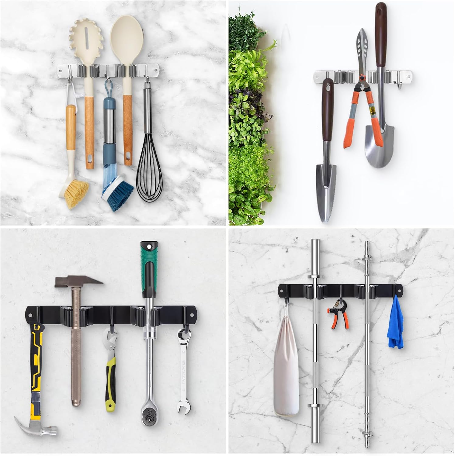 • [Easy To Use] The broom & mop storage organizer is easy to use, the grippers are flexible and can hold large and small handles, it can hold about 20 Ponds with self-adhesive ( or 50 Pounds if use screws) tools in total. Push the mop or comand broom handle into the clamps with easy after finish your household cleaning, or use the tool hangers for garage organizer wall mounted, essential garage storage & organization products of your house.