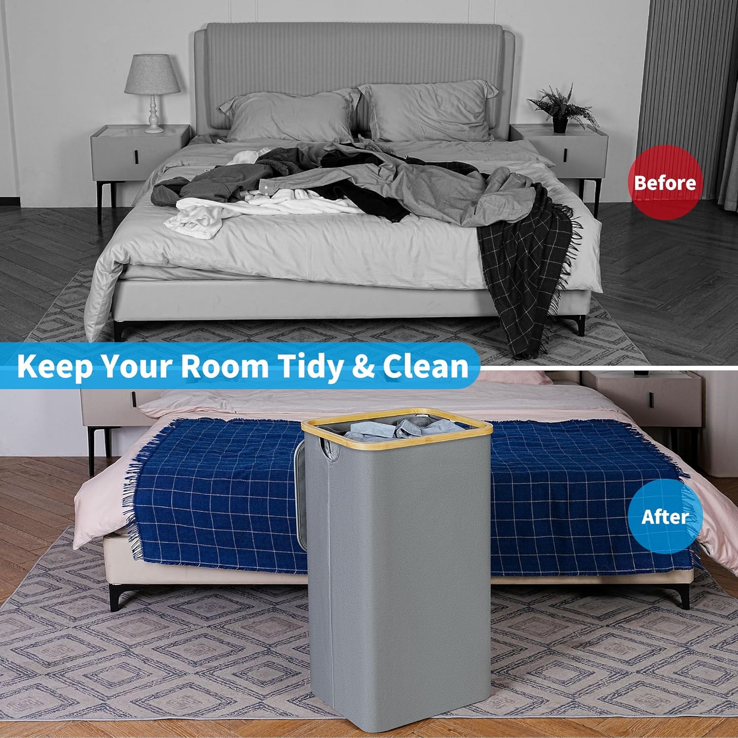 • 【Easy to Install & Fold】Thanks to the simple and compact design of the hamper. You can quickly assemble this large laundry basket in just 3 minutes without tools.You can easily collapse it when not in use.
