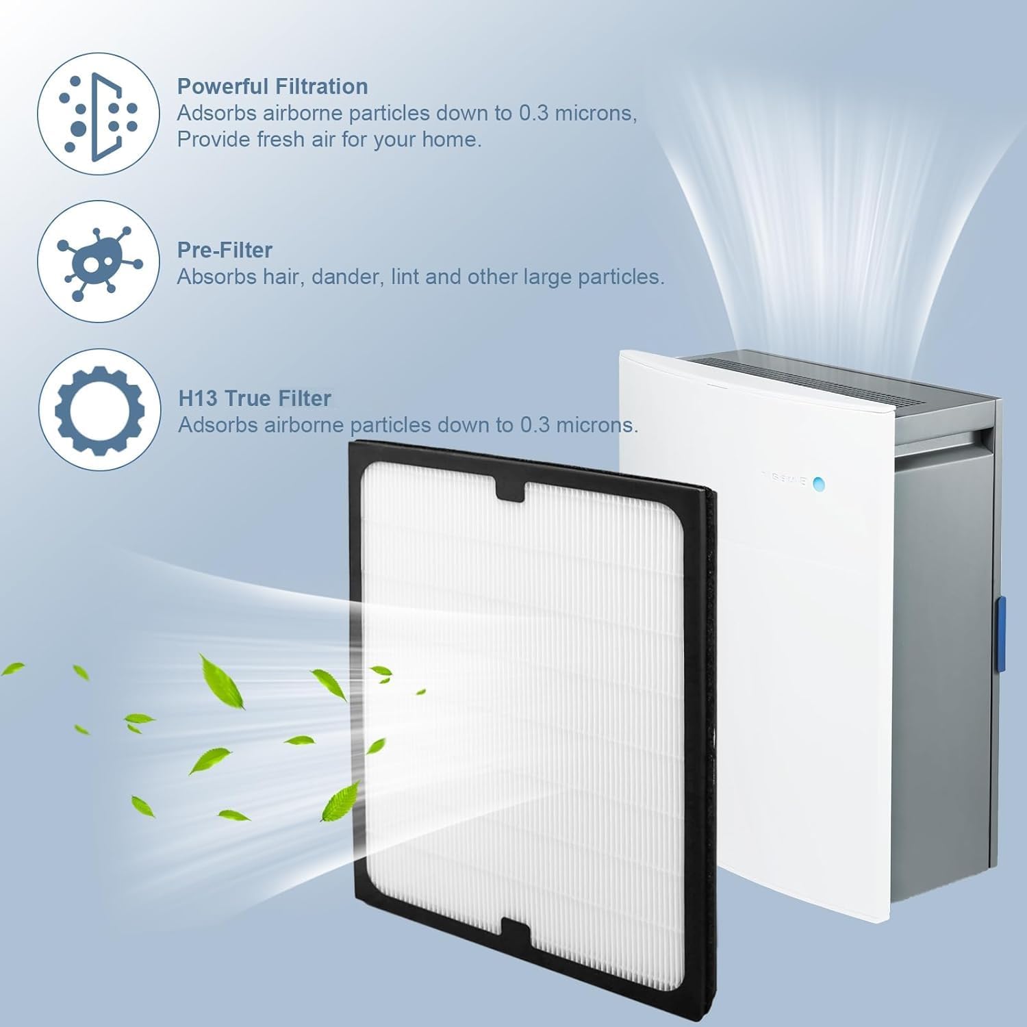 • 3-in-1 Efficient Filtration:Blue Classic 200 Series Particle Filter adopts double-layer filtration technology, which absorbs pet plush、household waste, volatile organic compounds and smoke components through pre filters and carbon filters, providing fresh air for your family.