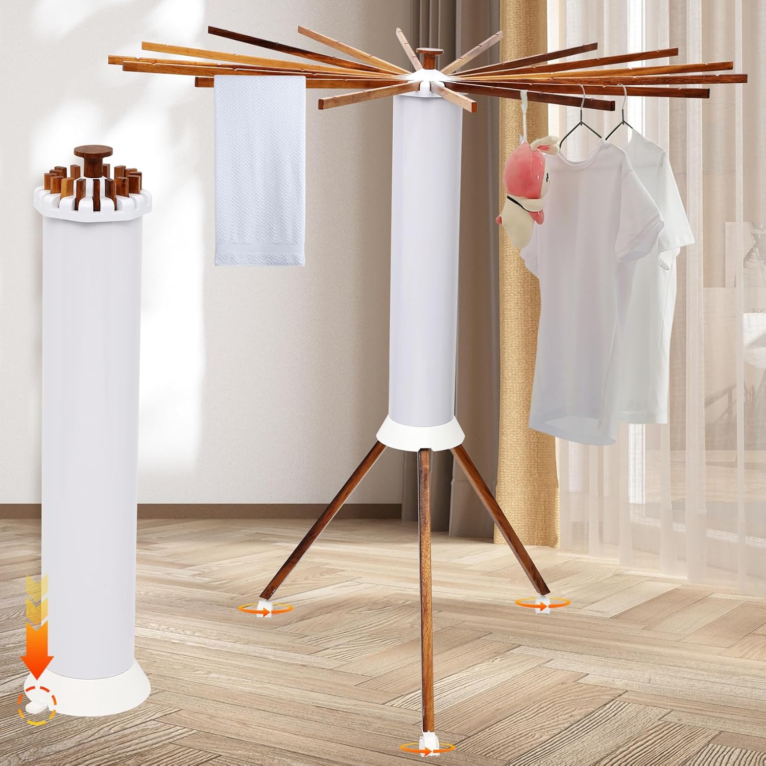 • Space-Saving & Tool-Free Assembly Quick fold/unfold design saves 90% storage space – ideal for small apartments or homes without dryers Patented tripod structure ensures stability in tight spaces (holds up to 45 lbs / 20 kg) Expandable arms (16 rods included + 2 spare rods) adapt to different drying needs