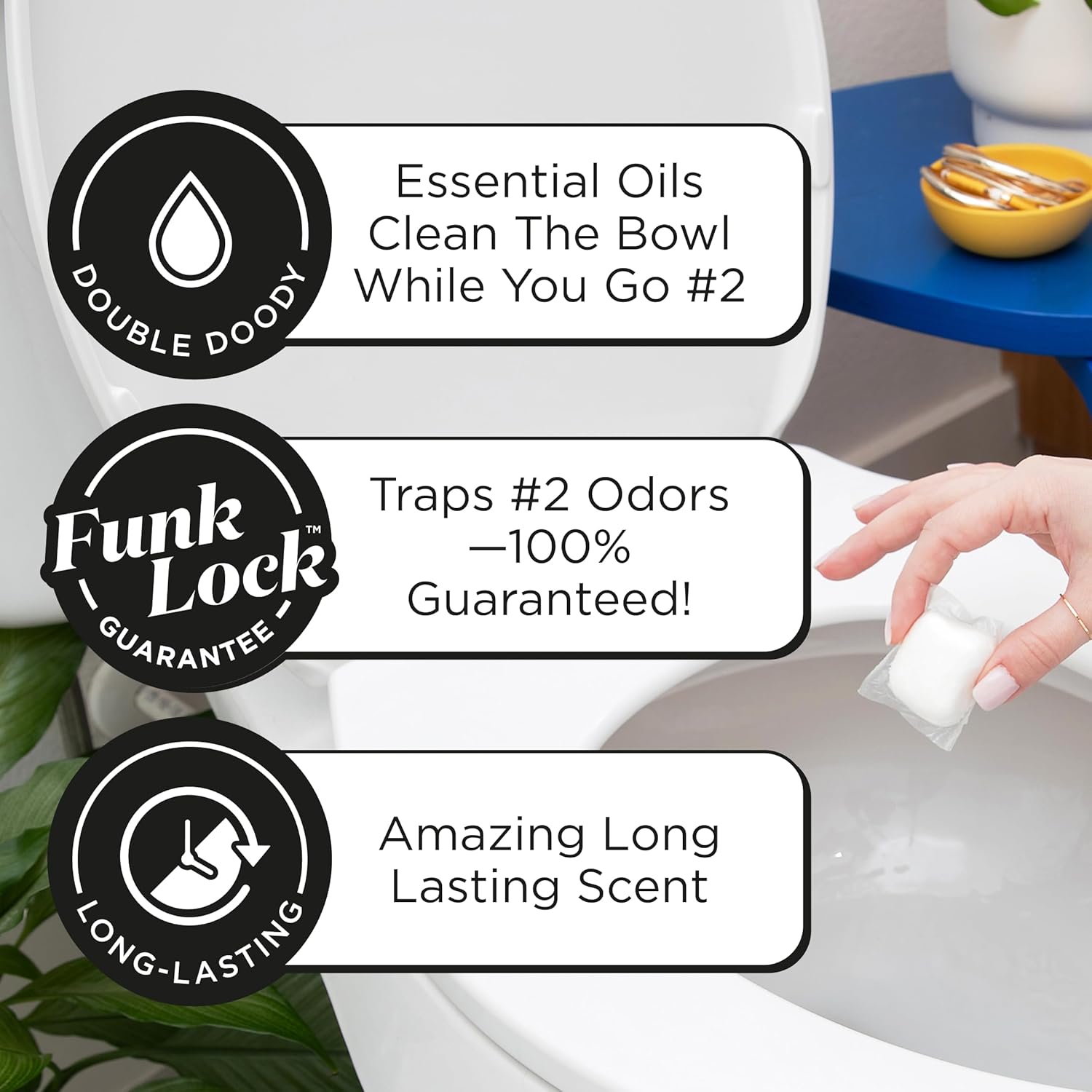 • Instant Odor Deodorizer: Advanced Funk Lock Technology traps bathroom odors below the water surface before they escape into the air. Drop before you go for complete odor freshener that actually works. No more awkward exits or lingering smells