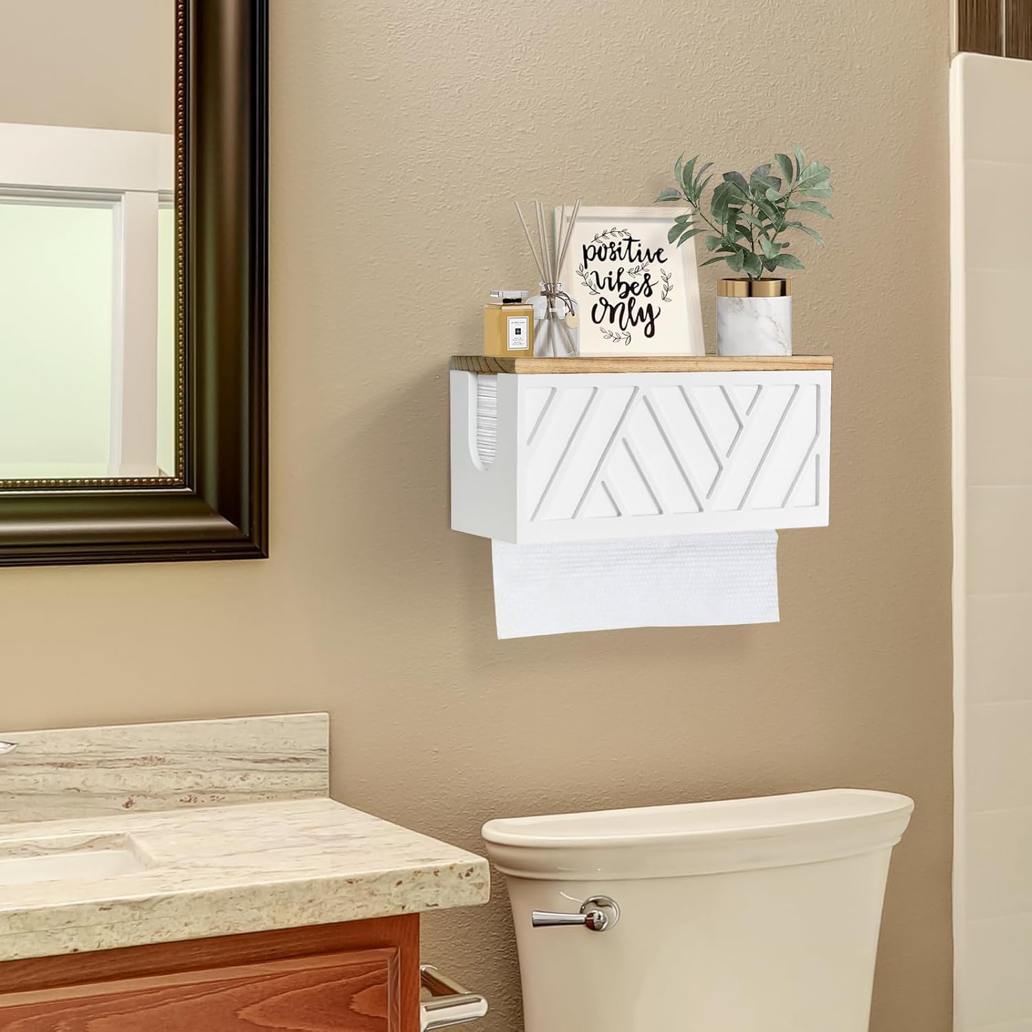 • 【Paper Towel Holder Wall Mount with Lid】No more need bulky plastic commercial paper towel dispensers! Our wood paper towel dispenser measures is 12”L x 5”W x 5.2”H and which is perfect for storing c-fold, z-fold, trifold hand towel, paper towel, face towel, napkin for kitchen, bathroom and living room. The paper towel dispenser holder wall mounted is designed with removable lid, you can use it as a separate tray for keeping your accessories in order.(Note: Not suitable for roll paper towel)