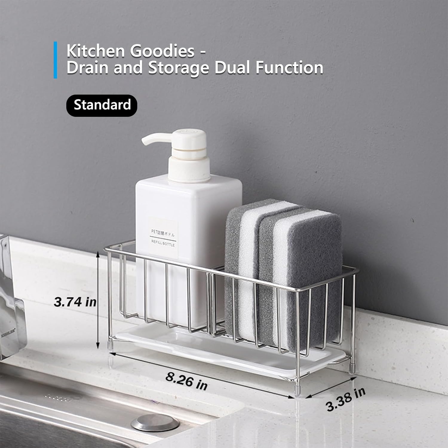• 【Made of High-Quality Material】Kvaciva kitchen sink sponge holder is made of high-quality stainless steel, which effectively prevents rust and deformation. The bottom has a non-slip rubber pad to effectively protect the countertop from scratches. There is a 1cm gap at the bottom to prevent debris from easily accumulating. .You can easily treat countertop stains with a running faucet, making the most of your countertop space.