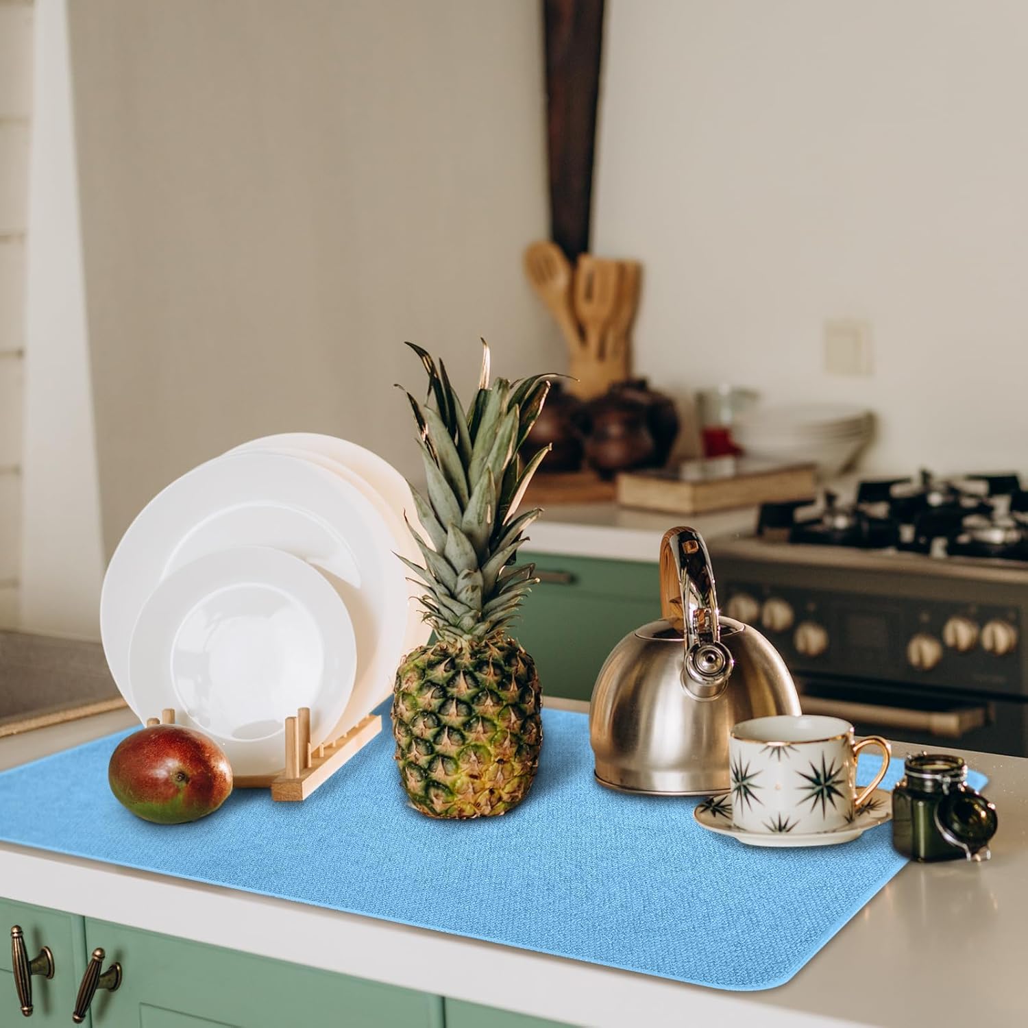 • Reliable Material and Attractive Design: get the ideal balance of functionality and style with our kitchen drying mats for dishes; Made from microfiber, these mats exhibit impressive water absorbent property, ensuring a dry, clean countertop; Their pleasing blue color will effortlessly blend with most kitchen interior, enhancing its aesthetics