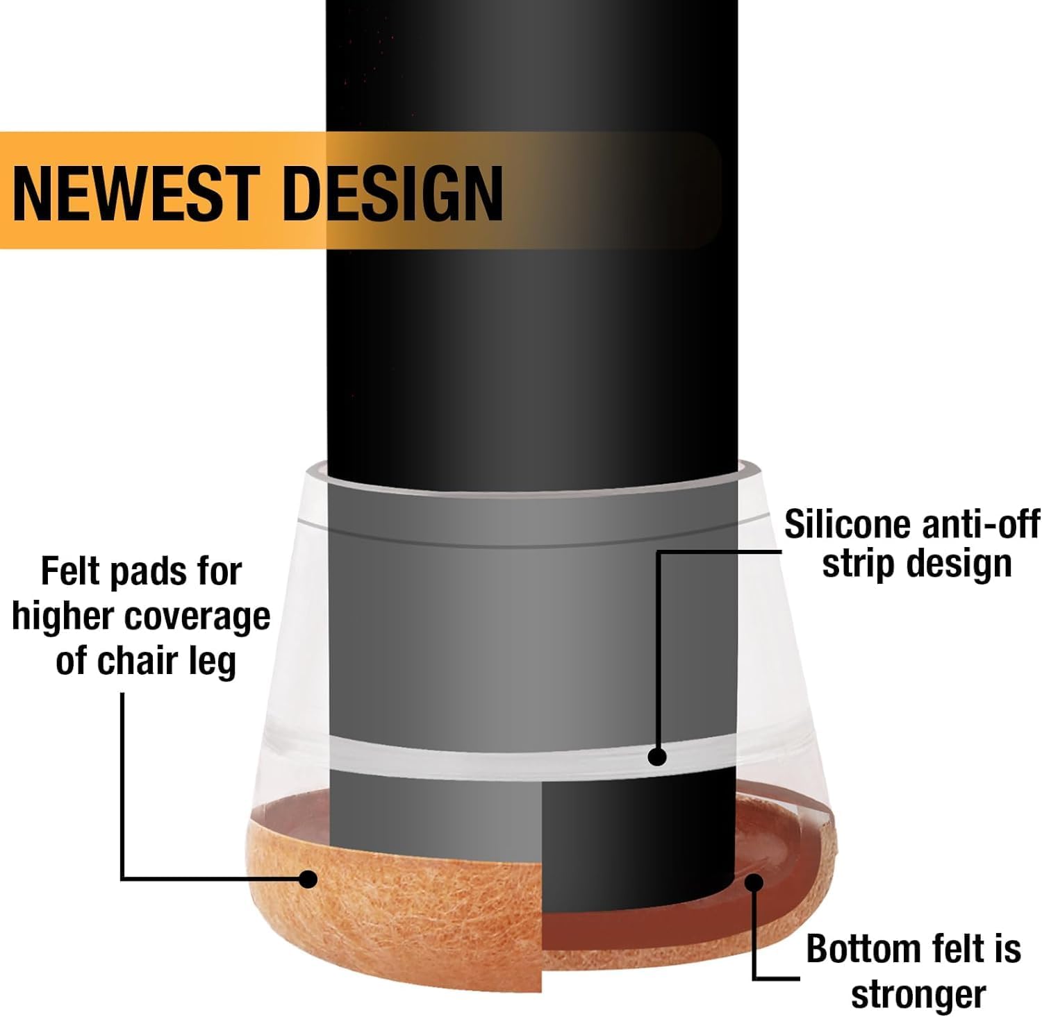• 【Upgrade New Design】: 360° full felt pad bottom wrapped, which helps the felt bottom be able to touch the floor at any angle, preventing scratching the floor. Our chair leg floor protectors do not use gel. The bottom felt pad and the silicone chair leg floor protectors are integrated with a high-pressure machine to ensure that they will never fall off.