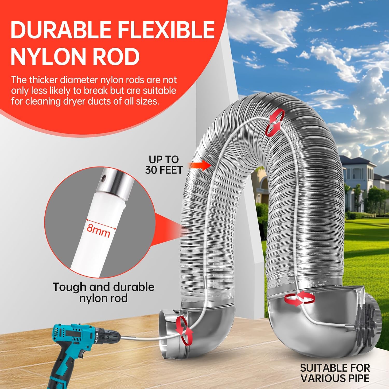 • 【EASY TO USE】:Simply align the joints of the two rods and turn clockwise. The Dryer vent cleaning kit is easy to attach and retract, withstands duct bends of 90 degrees or more, and can be used with or without an electric drill. Each dryer duct cleaning kit provides a metal drill attachment that attaches to an electric drill to quickly and easily clean dryer vents and help you achieve professional results.