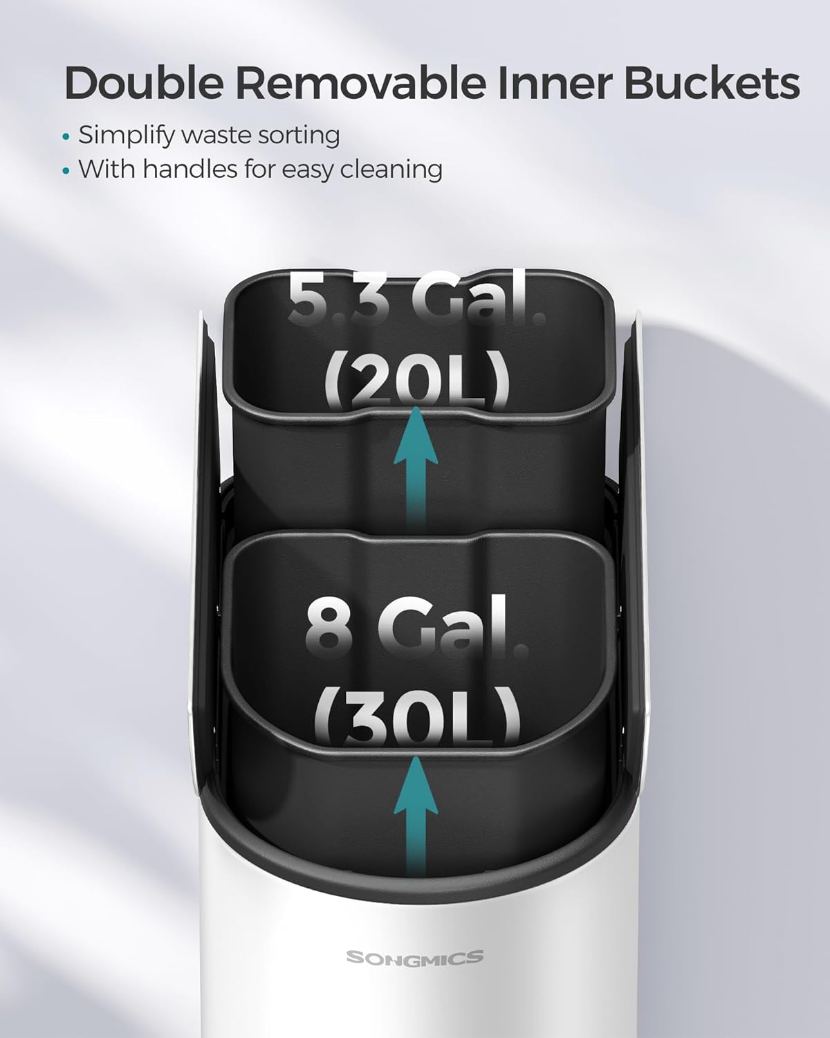 • [Slim Dual-Compartment Bin] This dual trash can, with capacities of 5.3 gallons and 8 gallons, conveniently sorts regular waste from recyclables. Its slim profile perfectly fits into narrow spaces, making kitchen waste management a breeze