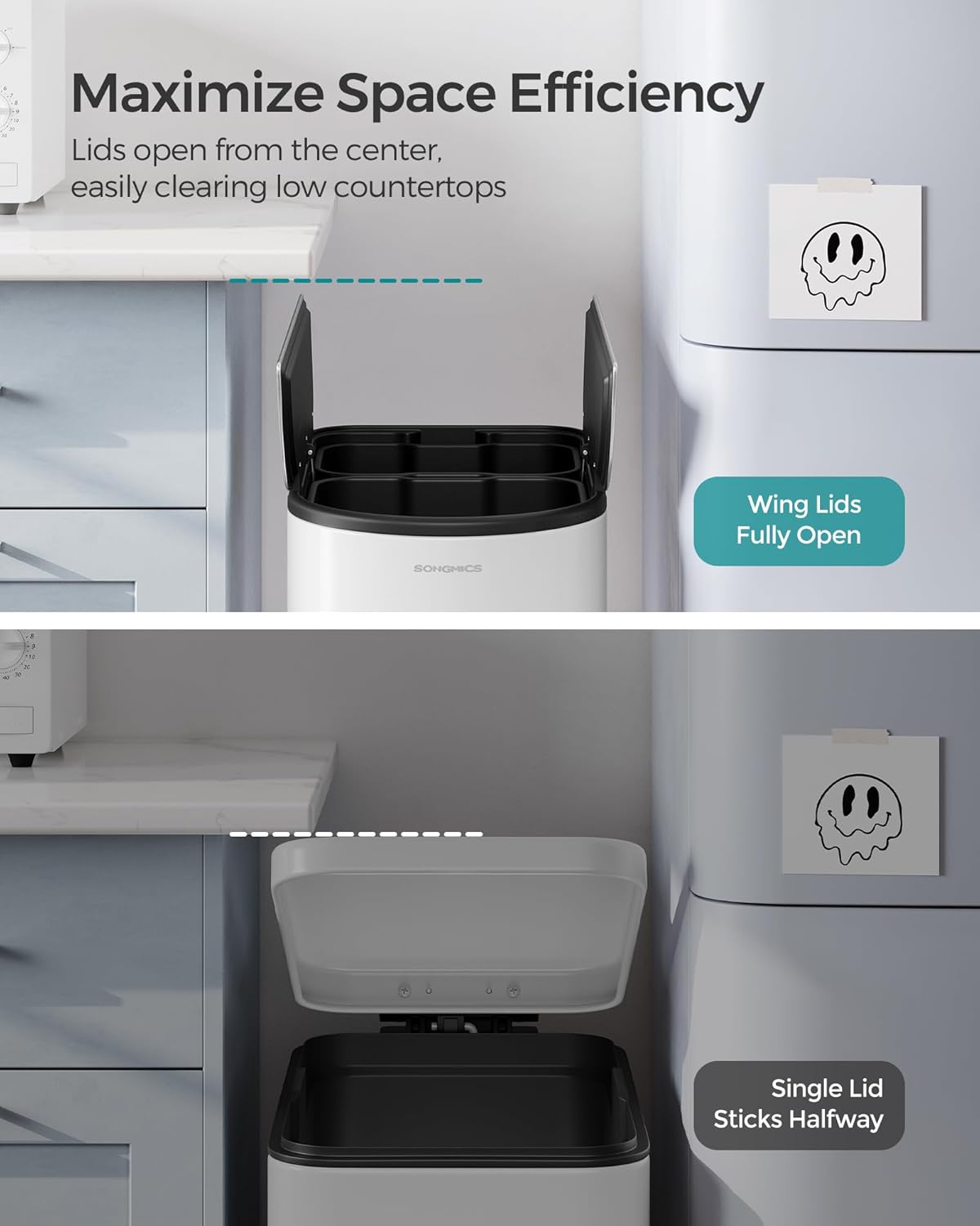 • [Efficient Wing Lids] The lids open from the center to easily clear low countertops for maximum space efficiency. The rounded corners prevent tearing of bags during removal