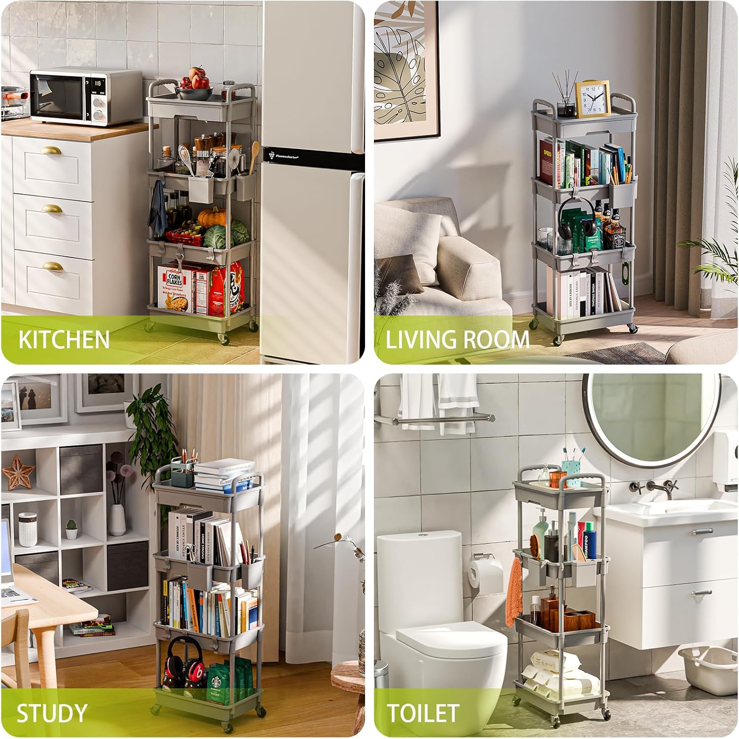 4 Tier Rolling Cart Organizer,Art Craft Diaper Bedside Snack Laundry Room Bathroom Organizer Narrow Thin Slim Rolling Trolley Utility Cart with Wheels for Kitchen,Office(Grey)