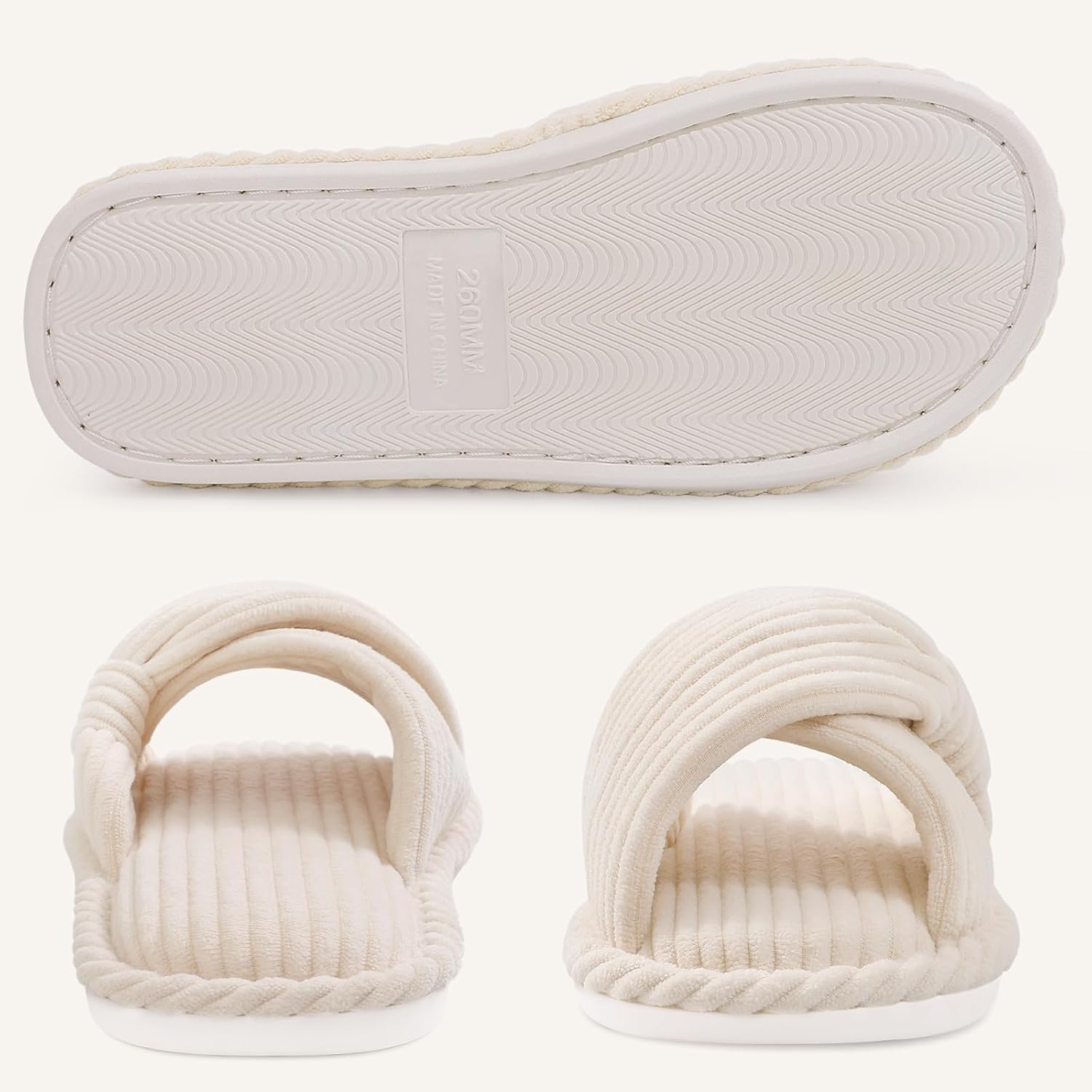 Evshine Summer House Slippers for Women Corduroy Cross Bow Indoor Slippers Open Toe Slip On Bedroom Shoes with Memory Foam