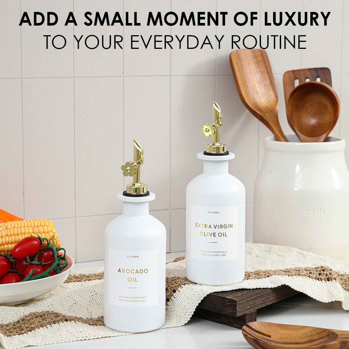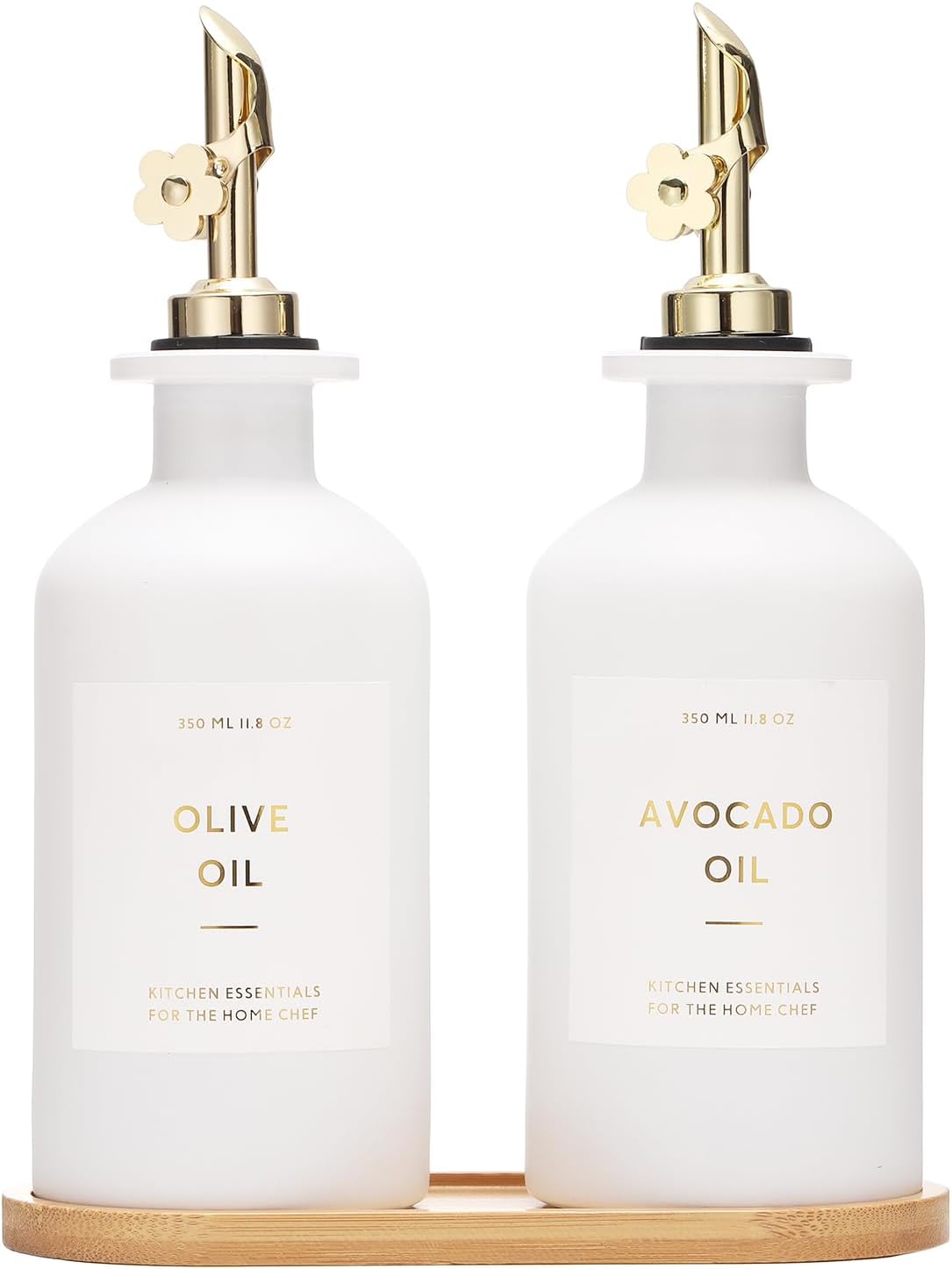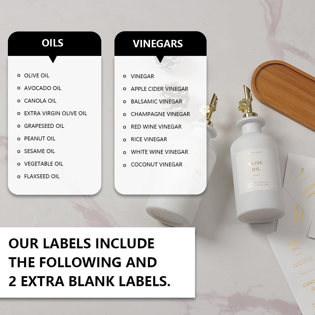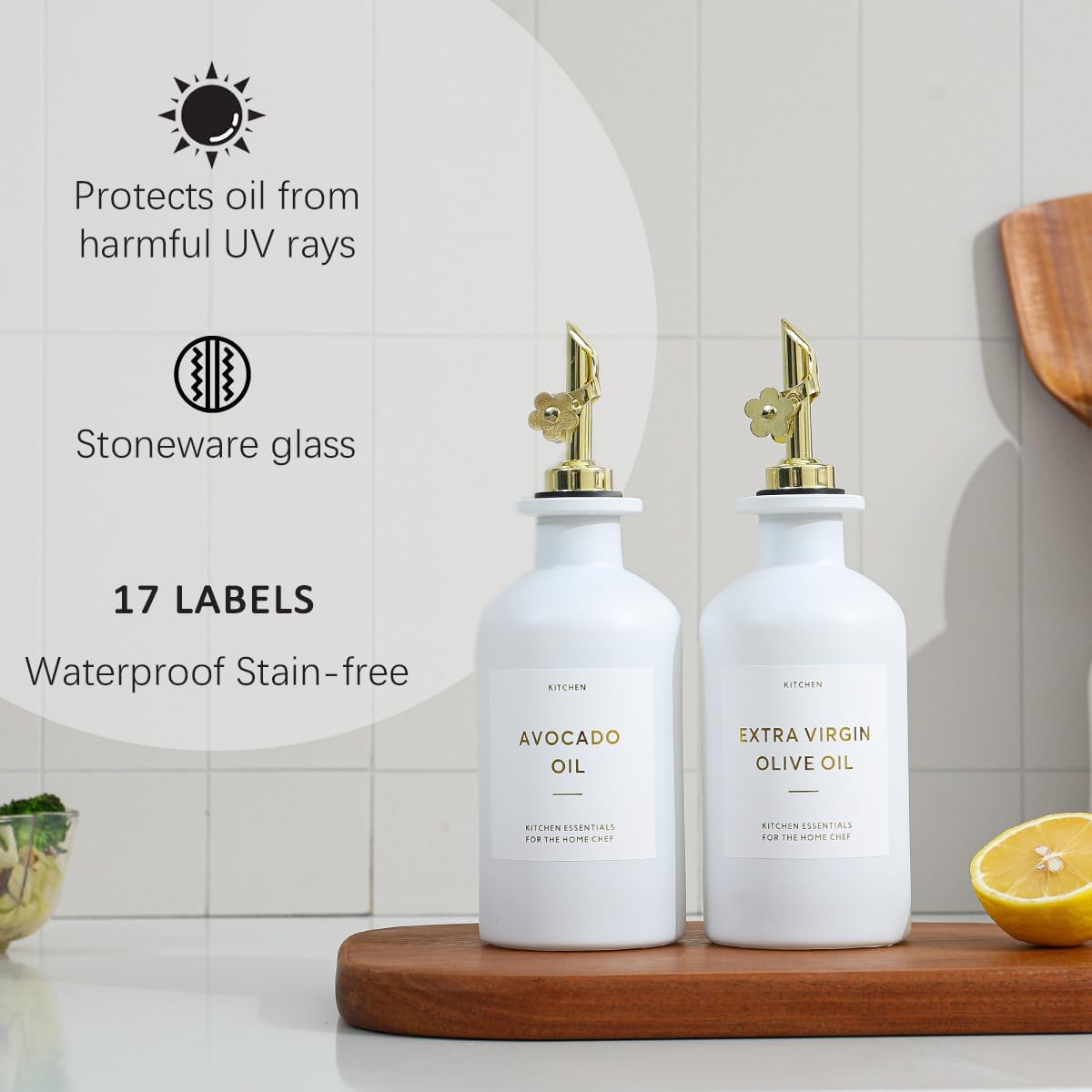 • 12oz KITCHEN OLIVE OIL DISPENSER BOTTLES – The oil and vinegar dispenser set contains 2 white 11.8oz (350ML) glass bottles, 2 gold stainless steel oil spouts, 17 waterproof labels(kinds of oil and vinegar) and a bamboo tray, Ideal for safely store and dispense your olive oil and vinegar.