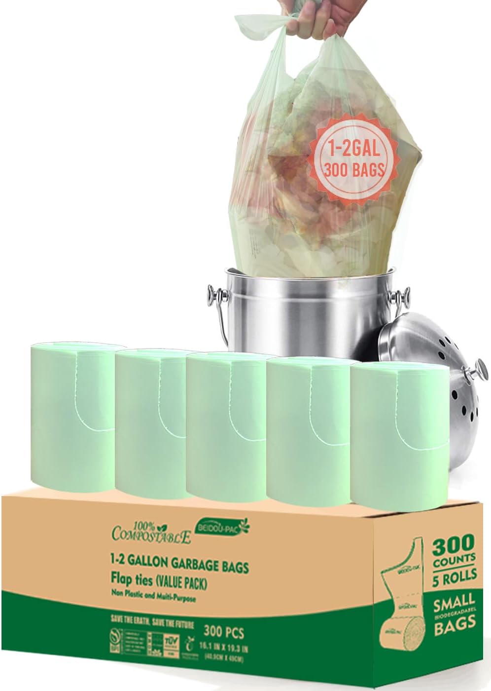 1-2 Gallon Flap Tie Compostable Trash Bags, 300 Count Small Compost Bags, Biodegradable Kitchen Garbage Bags, Food Scrap Waste Bags for Countertop Bin, ASTM D6400, US BPI Certified