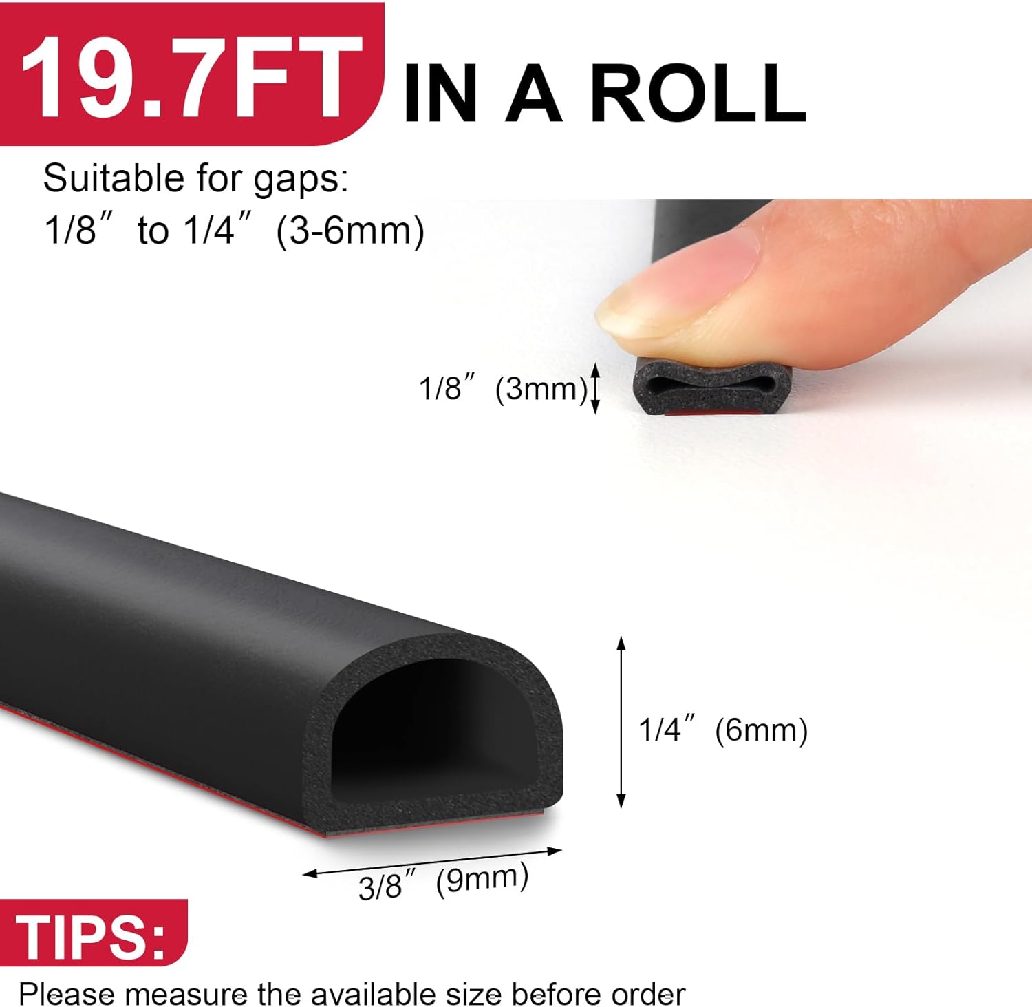 • Package Includes: The door weather stripping is 19.7 feet (6 meters) long, with a width of 3/8 inch (9mm) and a thickness of 1/4 inch (6mm). It is designed to fit gaps from 1/8 to 1/4 inch (3 to 6mm). Please measure the gap width before purchasing