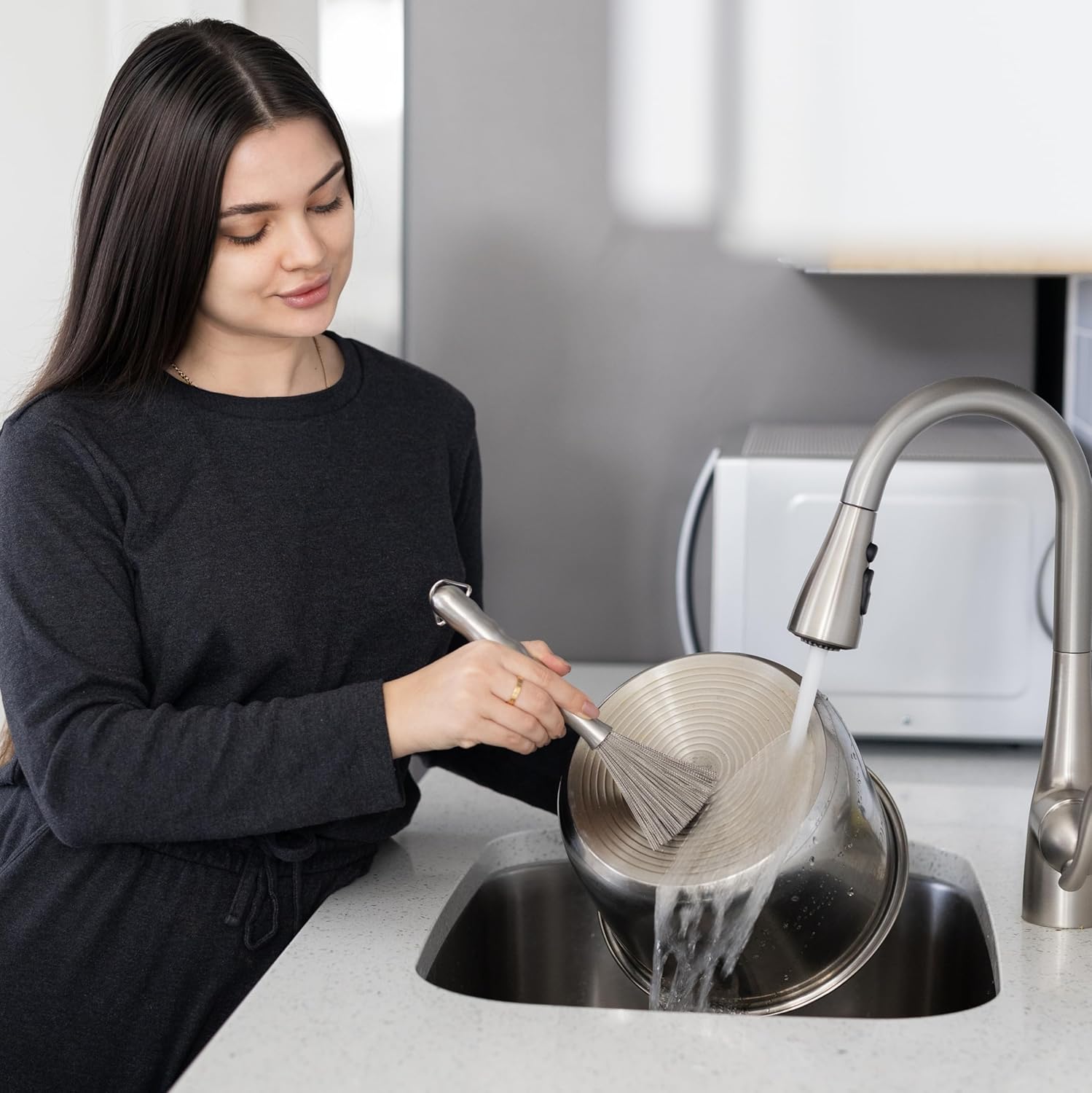 • CLEANS TOUGH MESSES: The stainless steel cleaning brush is designed to take care of almost any mess left in cups, pots, pan, plates, and tumblers! With a further reach and more durable bristles than most cleaning brushes, this scrubber will leave your dishes spotless!
