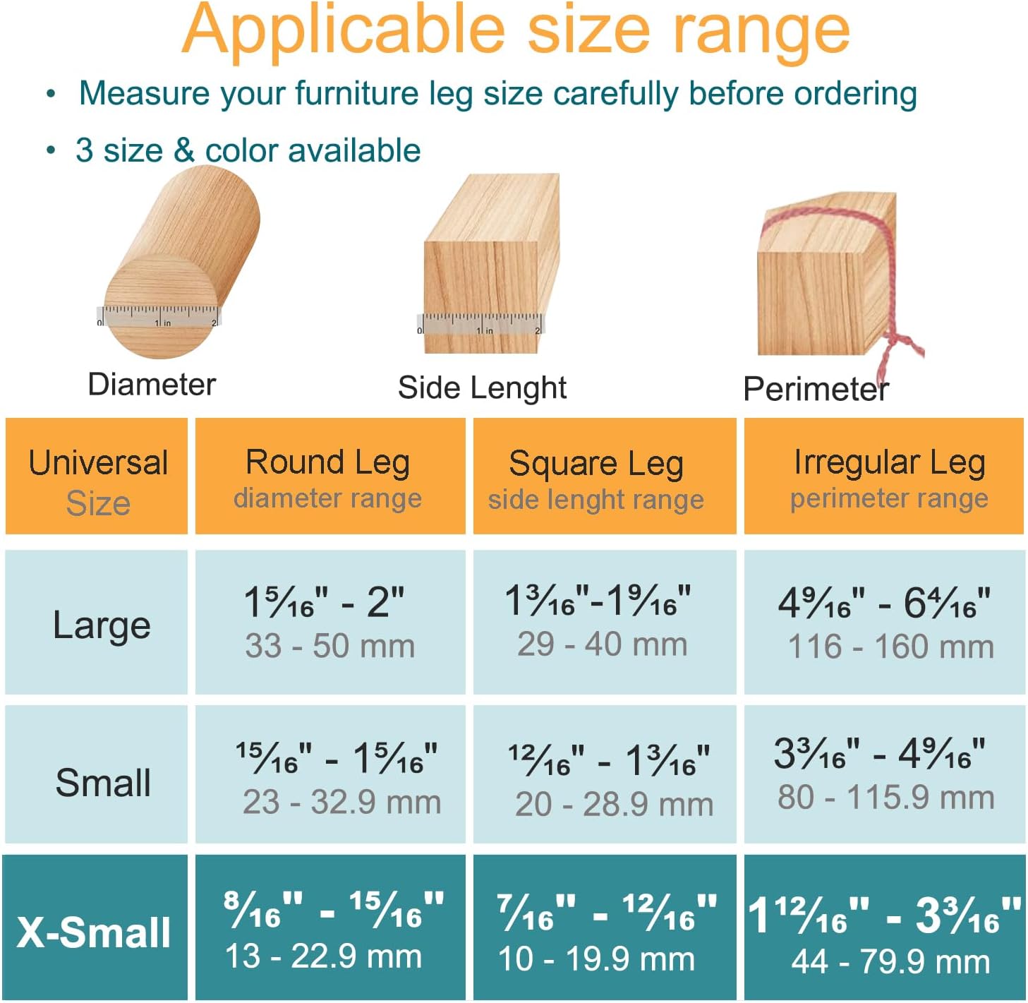 • 【Common size】 Suitable for chair foot with perimeter of 1-12/16" to 3-3/16" (44-79.9mm). Round diameter of 8/16" to 15/16" (13-22.9mm). Square length of 7/16” to 12/16" (10-19.9mm).