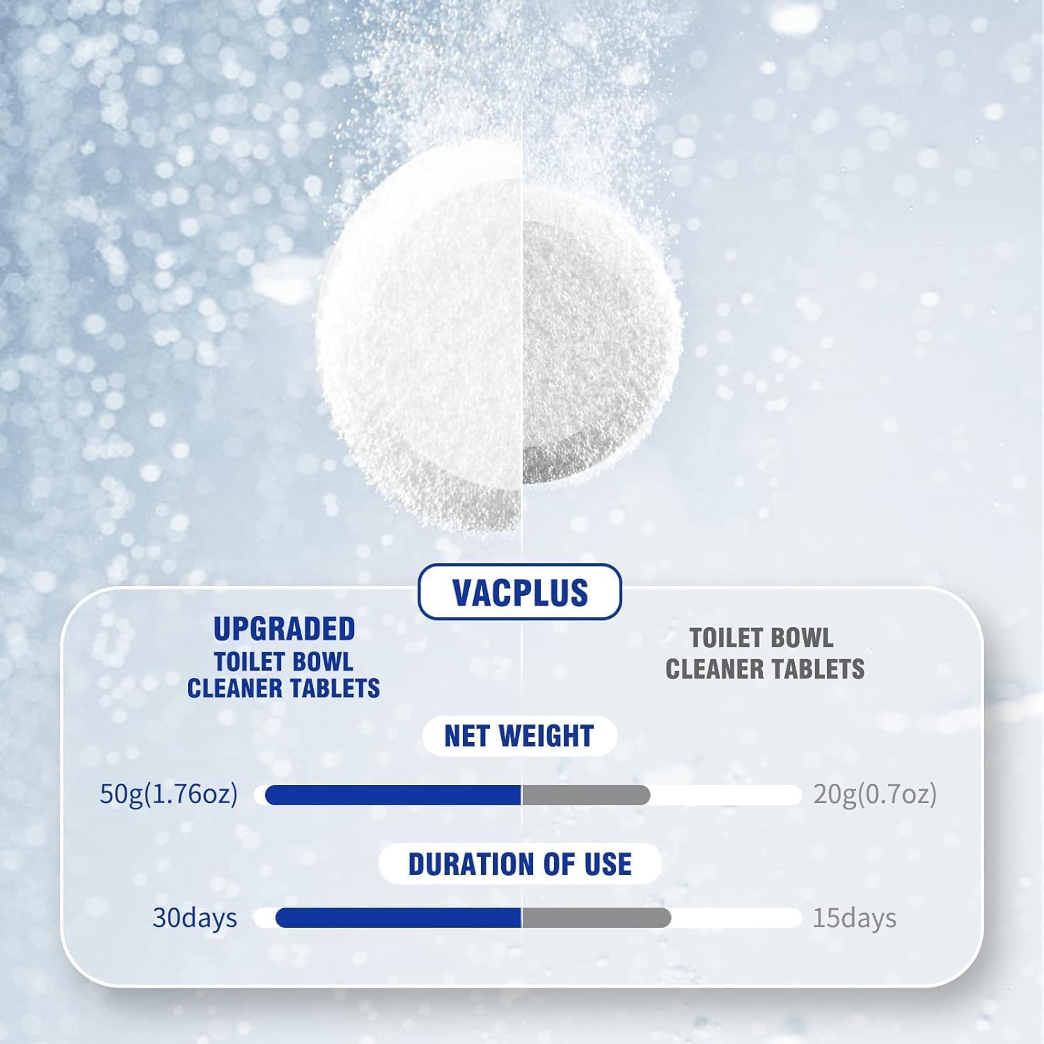 • LASTINGLY CLEAN: With an upgraded capacity of 50g each, a Vacplus toilet cleaner with bleach continuously cleans the toilet for up to 30 days. With 24 packs for replacement use, Vacplus toilet tablets can keep the toilet bowl fresh for more than 24 months.