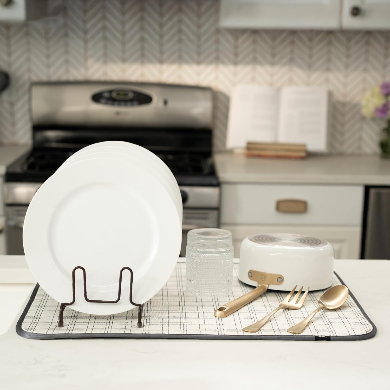 S&T INC. Dish Drying Mat XL, 18” x 24”, Absorbent Microfiber Kitchen Counter Mat, Dish Drying Pad for Dishes, Utensils, Pots and Pans, Extra Large, Stitched Plaid