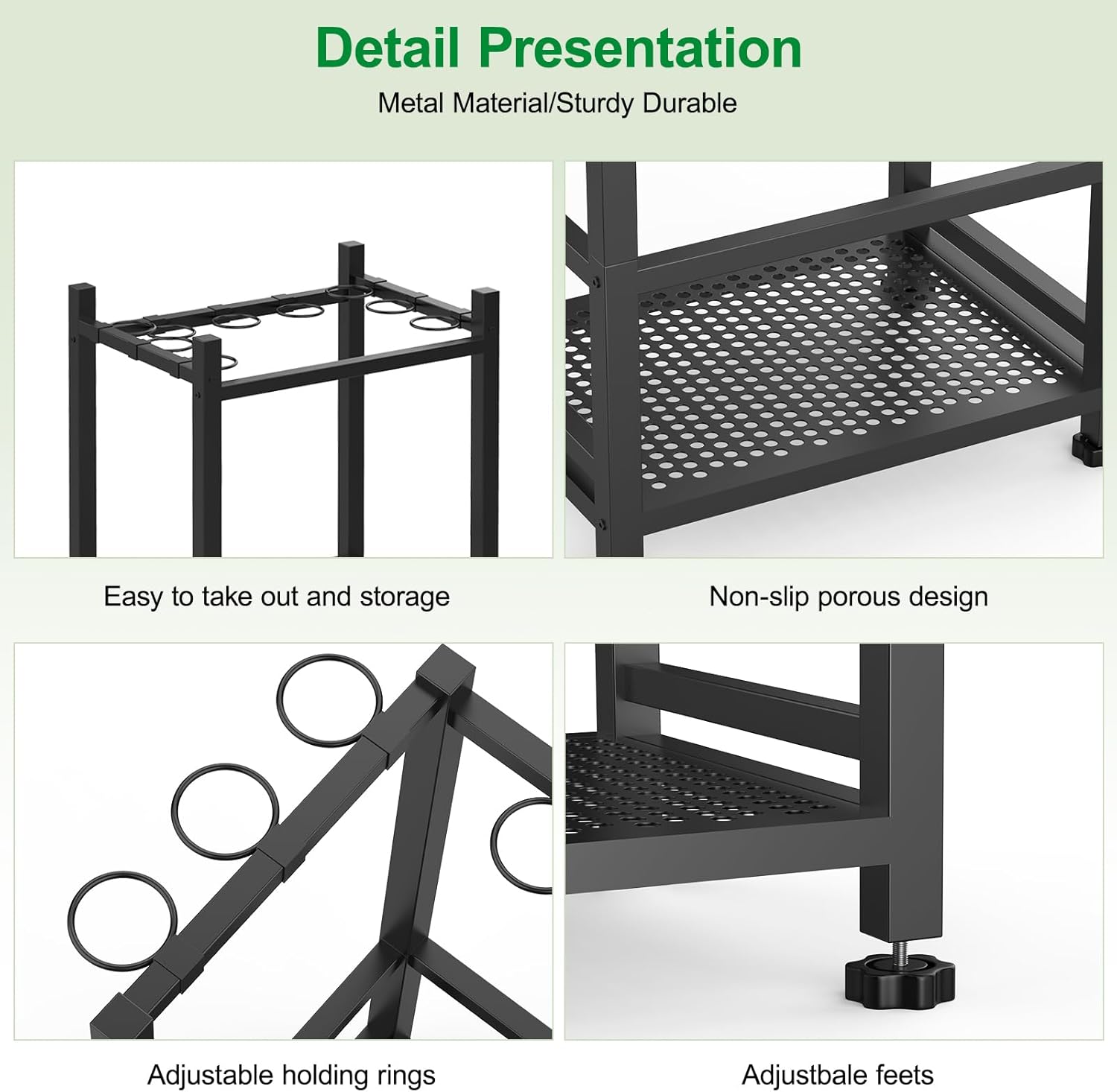 • MULTI-PURPOSE YARD TOOL ORGANIZER: The lawn tool organizer for garage is a must-have for your garden and garage. It is designed with 9 rings to hold handheld tools with larger heads like garden rake, skimmer net. The interior of the holder is arranged to store brooms,mops, hoes, shovels, hammers and other farming tools, categorizing and storing farming tools. Adjustable feet design makes the rack adapt to different ground, especially suitable for indoor, outdoor, garage, shed and other places.