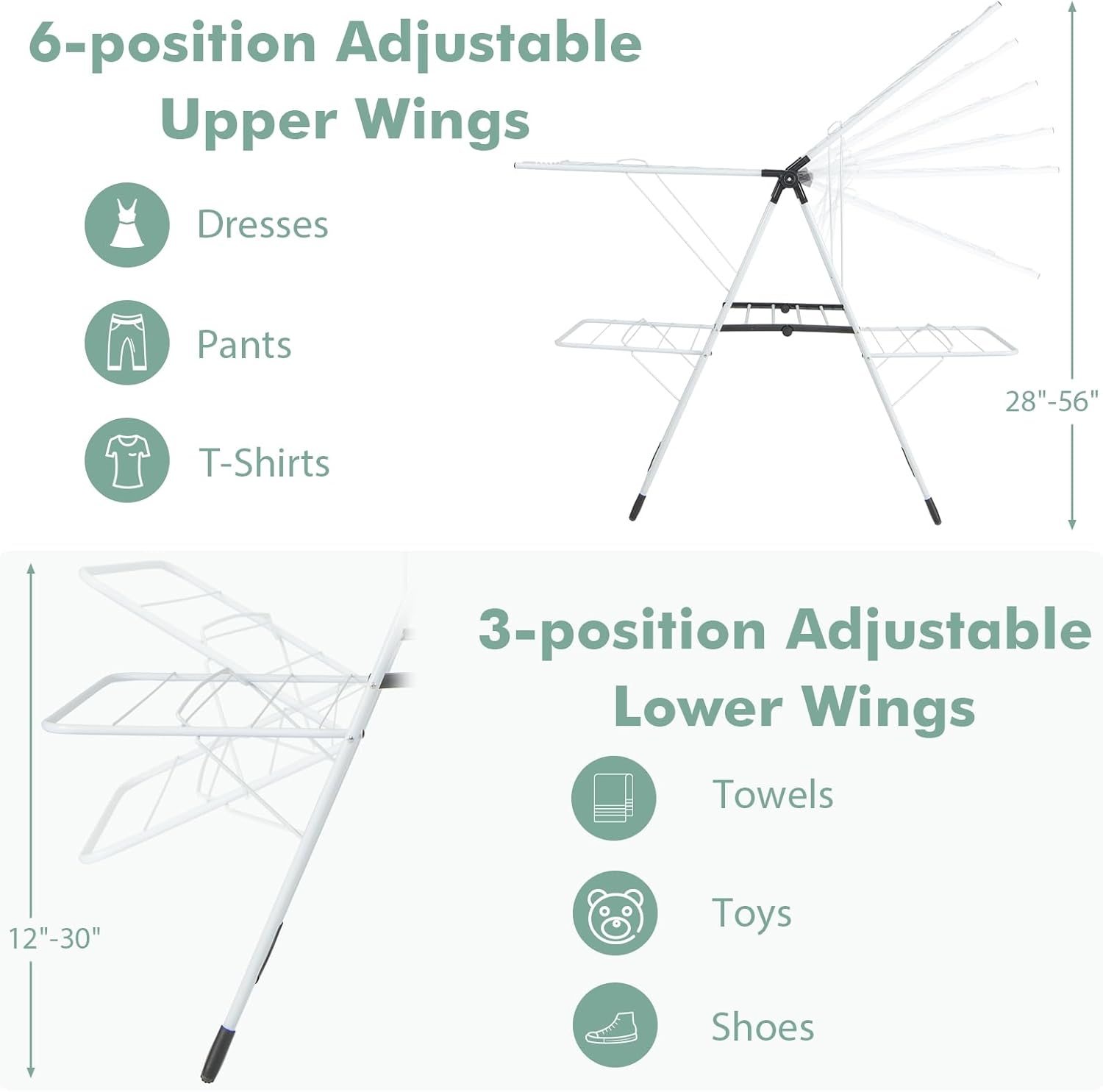 • [Adjustable Wings & Useful Clips]: With 6-position adjustable upper wings (28"-56") and 3-position adjustable lower wings (12"-30"), this drying rack offers versatile hanging options for items of different lengths. Besides, the rack also comes with practical sock clips, enhancing the hanging spaces for small items like socks and tank tops.