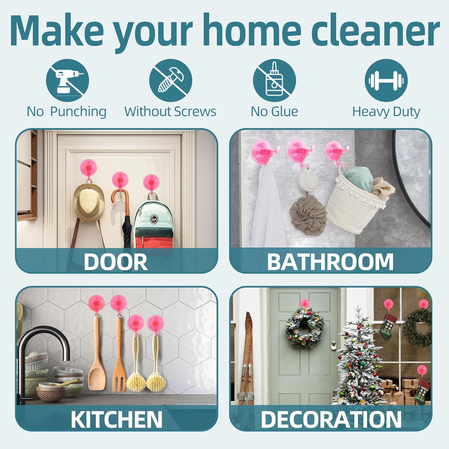 • 【Clear Hard Plastic】The Clear Suction Cup Hooks is made of premium plastic, no rust, no deformation, can perfectly organize your shower wall. Unlike Other brand in the market our suction cup hook is anti-hot-water max 158°F so your don't worry about falling off when shower hot water. Your can use it to hanging loofa, bath sponge, towel, robe, brush, clothes and more. Also suitable for outdoor glass windows Christmas wreath hanger