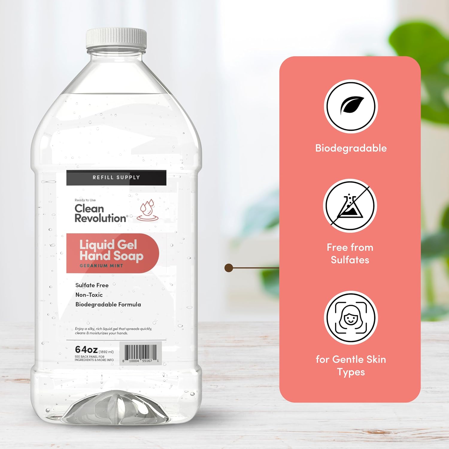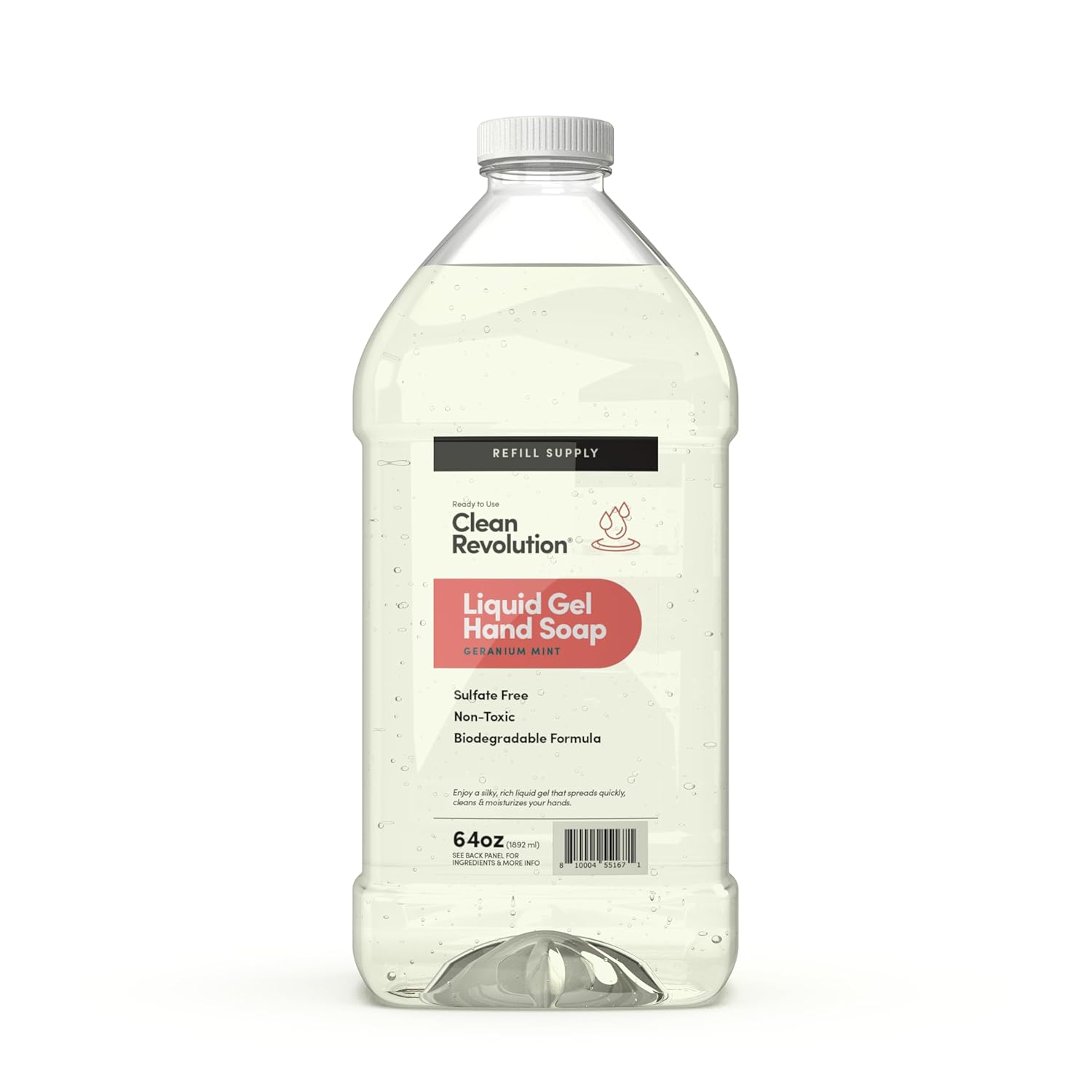 Clean Revolution Liquid Gel Hand Soap, Silky Rich Liquid, Quick Lather, Fast Rinsing, Contains Real Essential Oils (Geranium Mint) 64 Fl Oz