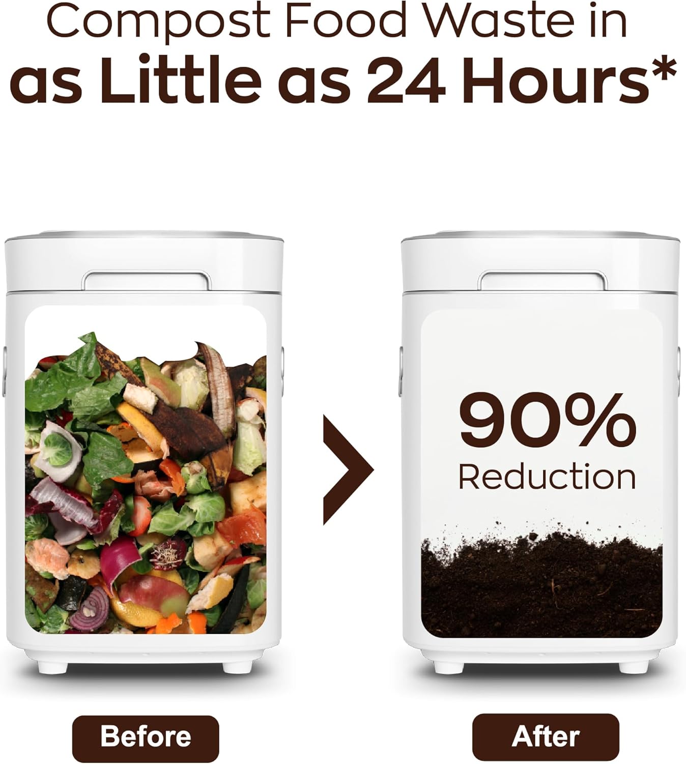 • AEROBIC COMPOSTING: Reencle creates an optimized environment that speeds up the microbial decomposition of food scraps. Reencle Electric Composter revolutionizes the decomposition process by effortlessly transforming 2.2 lbs of food scraps into nutrient-rich fertilizer in just 2-24 hours! Say goodbye to long waiting times and reduce up to 90% of your food waste effectively.