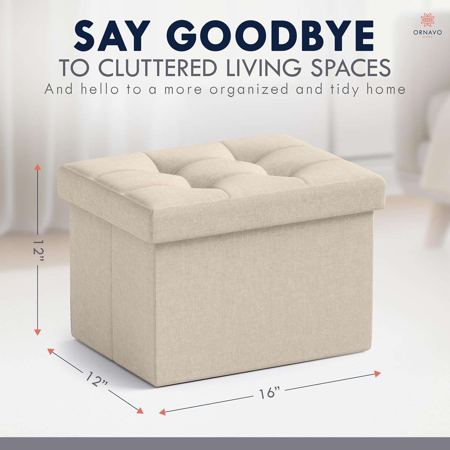 Ornavo Home Small Storage Ottoman Foldable Collapsible Rectangle Linen Ottoman Foot Rest Stool Seat, for Living Room, Bedroom, Home Office, Dorm - 12 x 16 x 12, Beige
