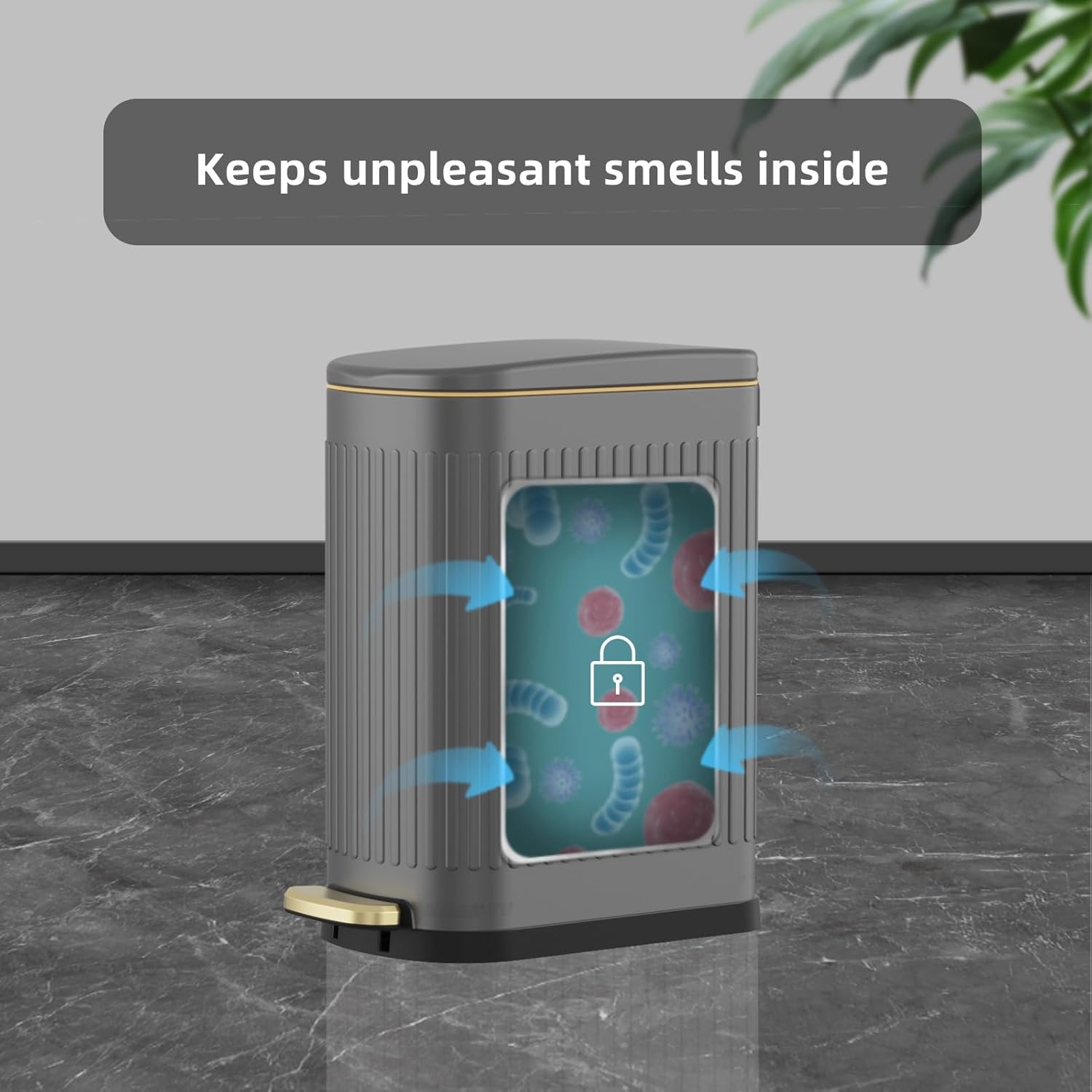 • 【COMPACT DESIGN】This 2.6 gallon step trash can is slim design, only 6.5 inch wide, the rectangular shape is the perfect size for inside cabinets, under counters, under sinks and other small spaces.