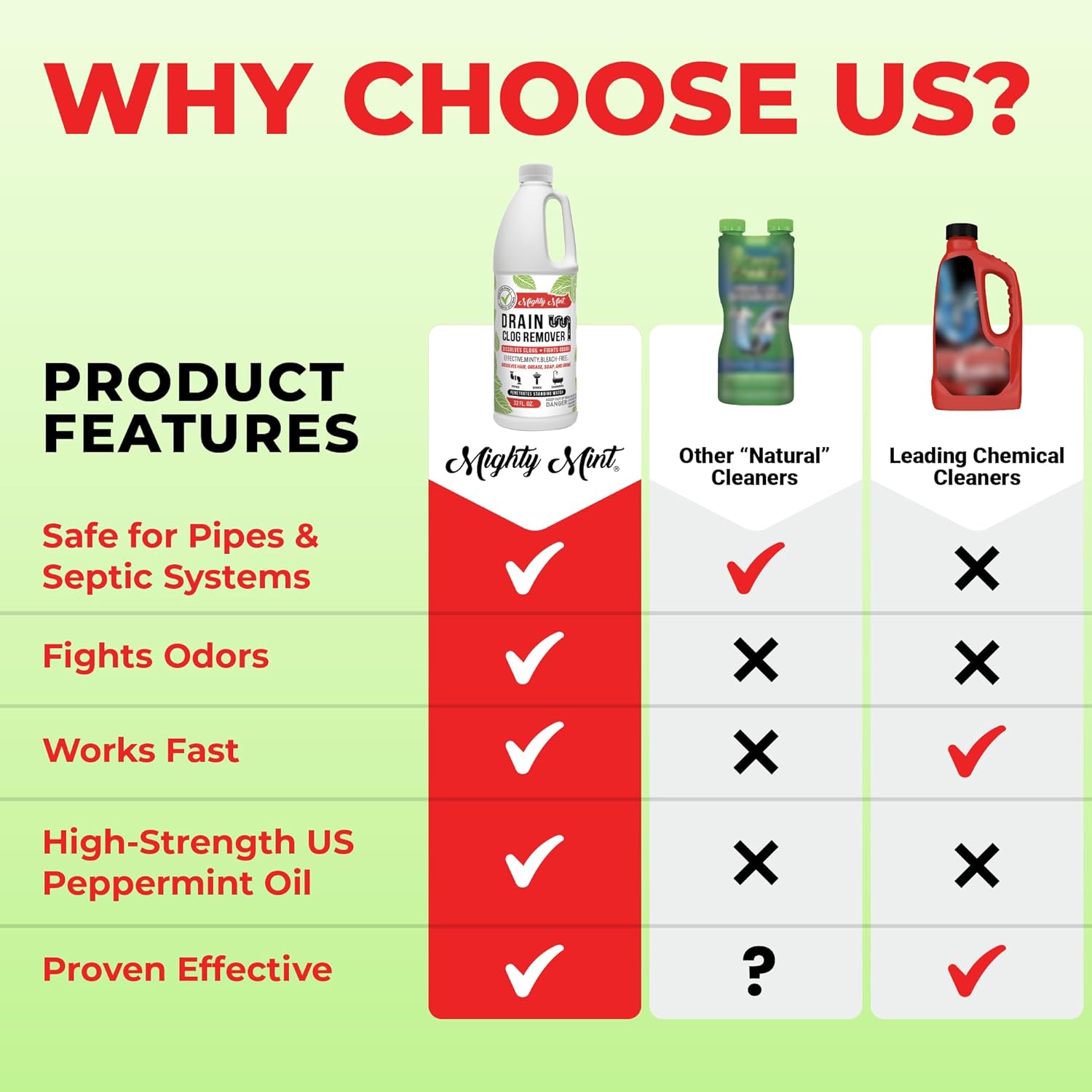 Mighty Mint Drain Clog Remover, Safe for Pipes and Septic, Dissolves Hair & Grease, Clears Blocked Drains and Deodorizes, Natural Mint Scent, 32oz