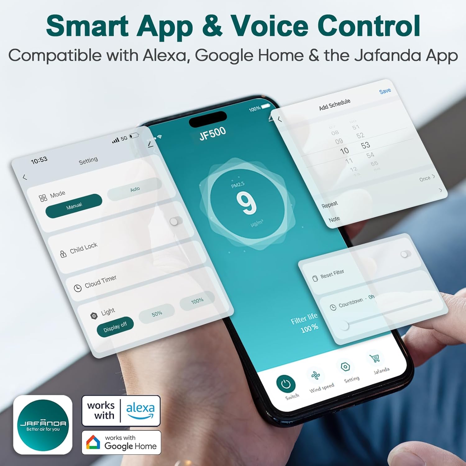 • Smart Home Integration for Easy Control:Connects to your phone via app Jafanda (iOS/Android) to adjust fan speeds, check filter life, and monitor air quality—even when you’re away. Works with voice assistants (Alexa/Google Assistant) too: just say “Hey Alexa, turn on the JF500 air purifier” for hands-free convenience
