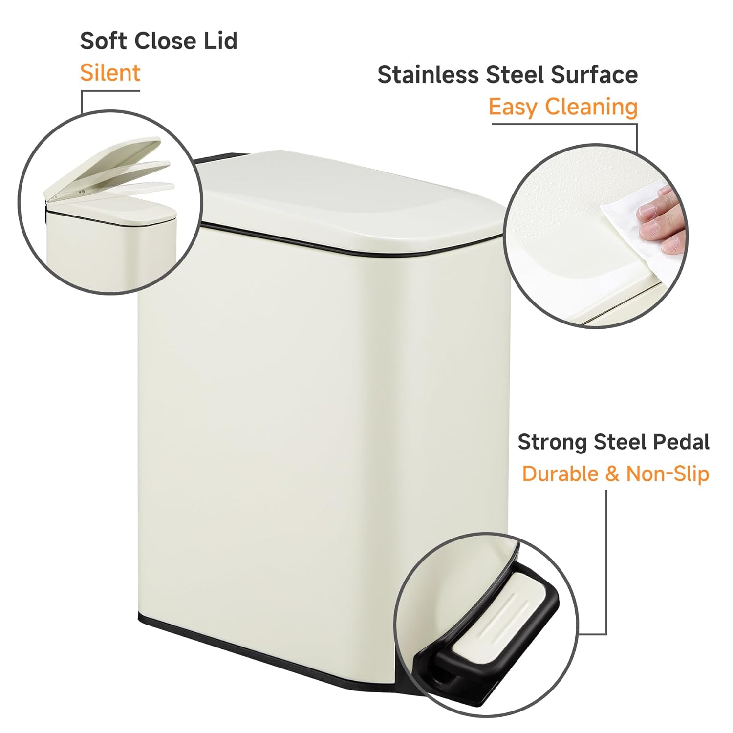 • Removable Inner Bucket: The inner bucket of the small trash bin can be easily removed to clean or waste disposal. The hole designed inside the bucket helps lock the garbage bag in place and hide extra trash bag