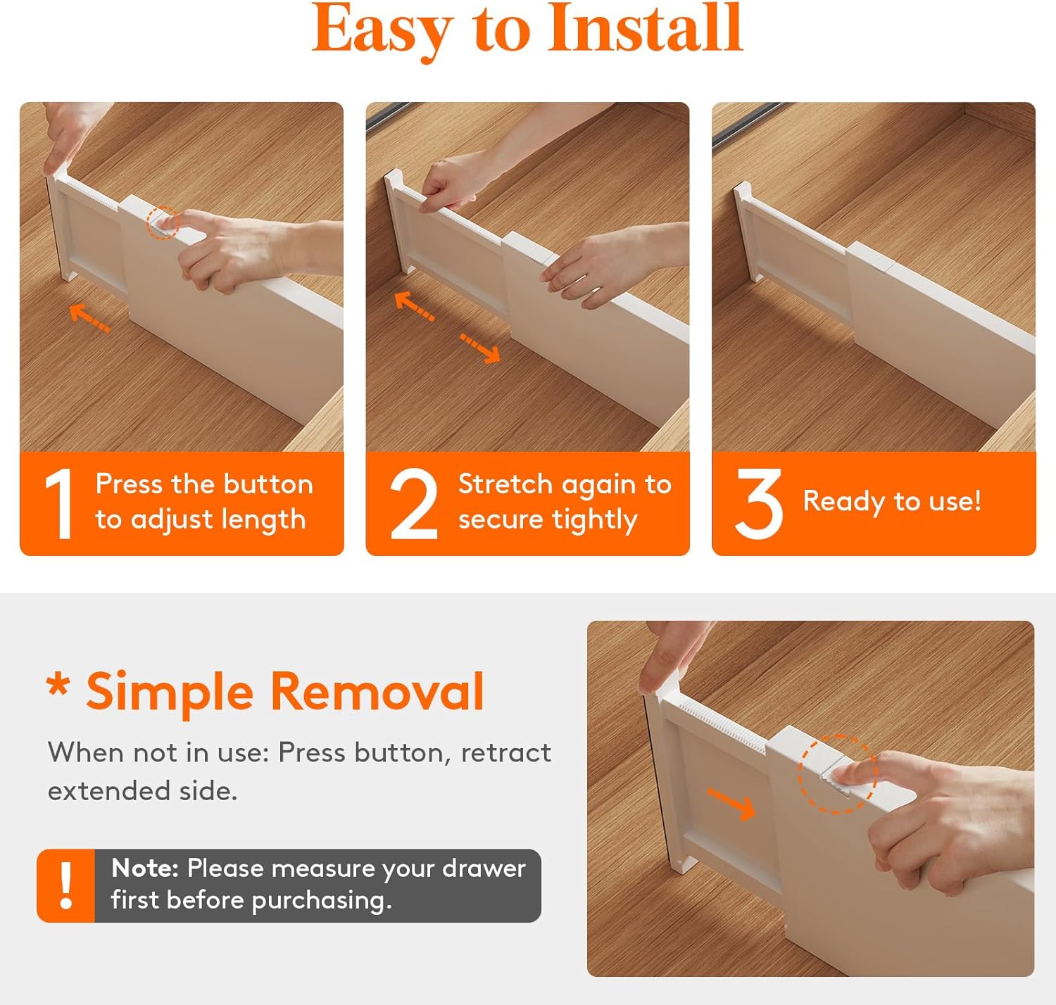 • Easy to Install: To adjust the length, press the top button before placing the drawer organizer, and then stretch it out again to secure it tightly. The strong spring tension keeps each organizer upright and secure. When retracting, press the top button and push in the stretched side.