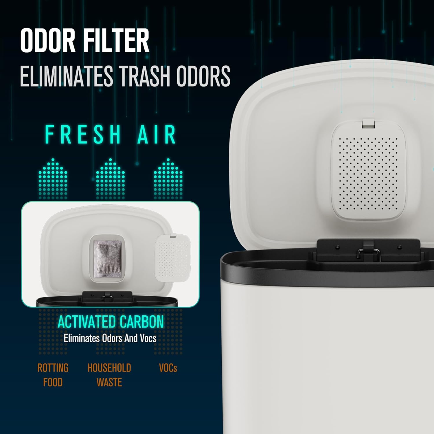 • Odor Control and Convenience: The curved surface top lid not only enhances the modern aesthetic but also conceals a convenient storage space for deodorizing products, keeping unpleasant odors at bay. Plus, we include 30 garbage bags for added convenience, saving you time and hassle.