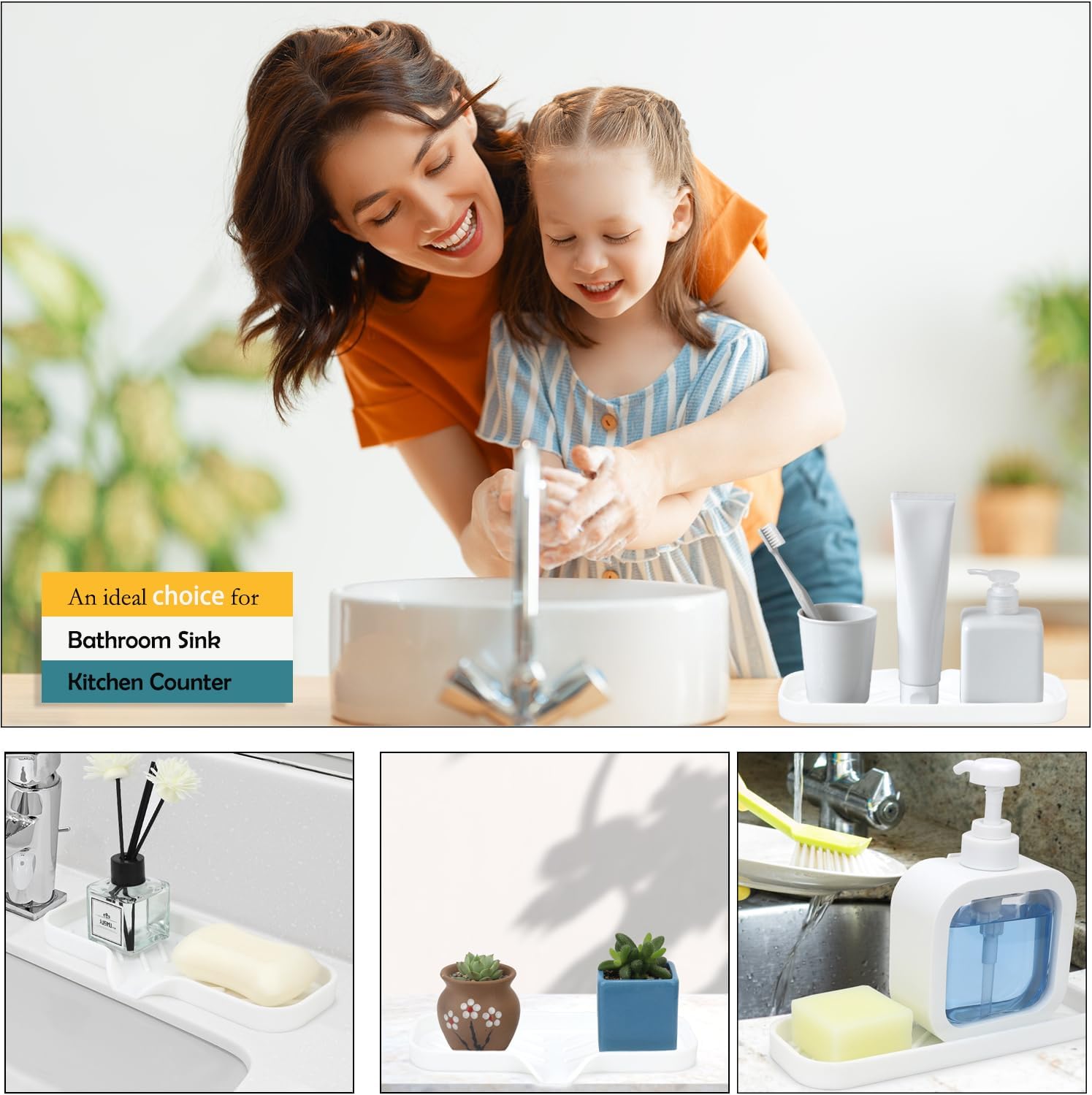 • ★Safe, Easy to Clean, Easy to Store: The soap dispenser tray is made from premium food grade silicone, so it’s safe for use in the kitchen or bathroom. The smooth surface of the soap dish makes it easy to clean, you can simply rinse or brush it with water, and it’s dishwasher safe. And its compact size makes it easy to store when not in use.