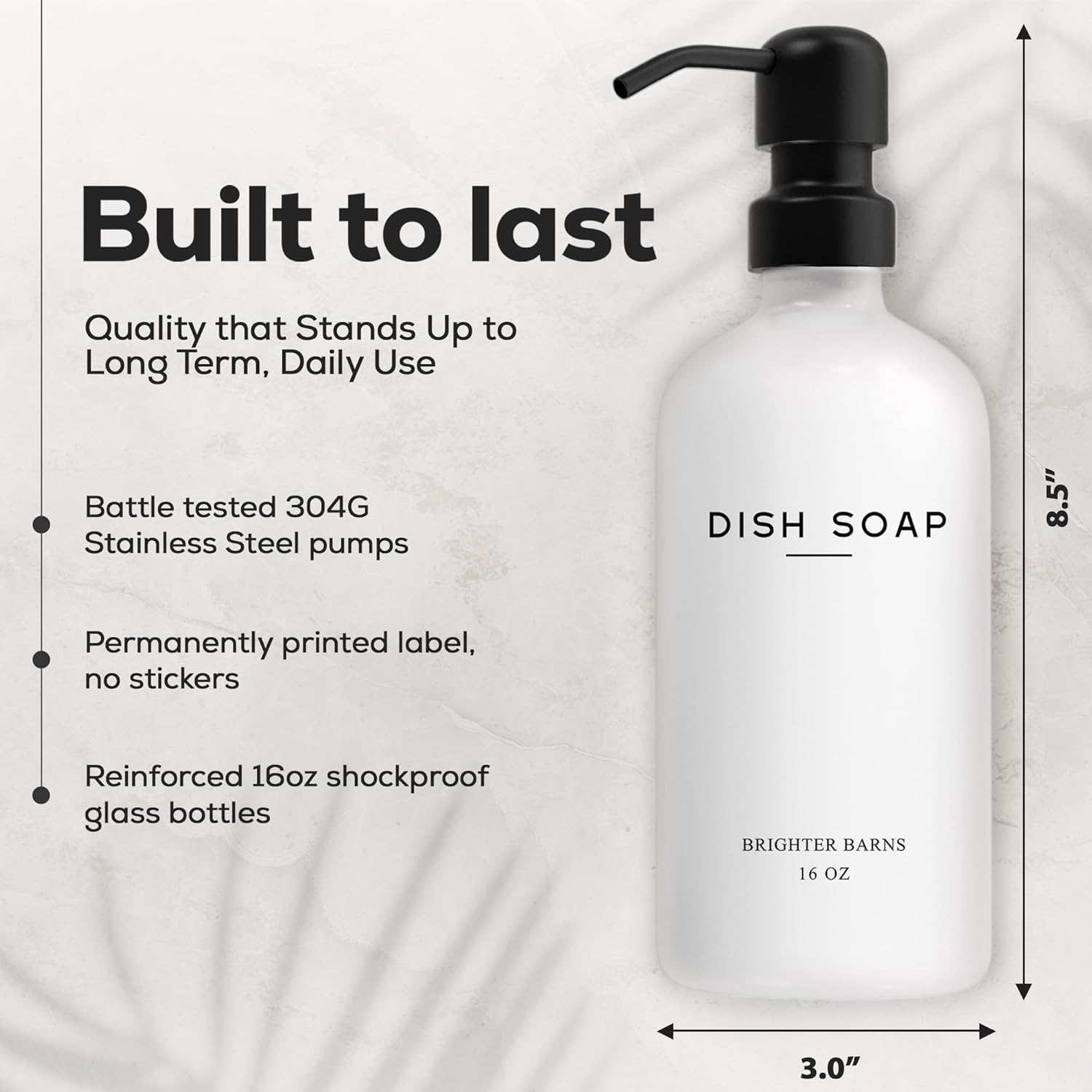 • AMERICAN DESIGN, UNCOMPROMISING QUALITY - Crafted with meticulous attention to detail, our glass soap dispenser set features 2 fortified 16oz glass bottles along with a set of corrosion-proof 304G stainless steel matte black pumps. All designed in the USA to provide unbeatable quality and enduring style that you can trust.