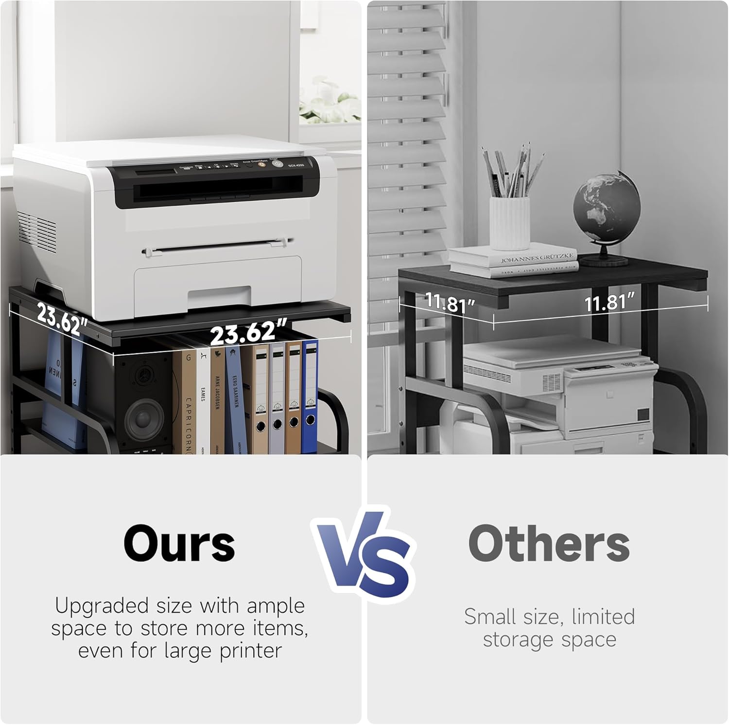 • 【Expanded Workspace & Height Flexibility】This printer stand conquer clutter with oversized 23.62”W×23.62”D×29.13”H tiers! Customize the middle shelf across 5 heights (9.45” range) for wide-format printers, 3D printer tables, or mini fridge stands. Massive surface area fits printers + scanners side-by-side, while the 29.13" height optimizes ergonomic access. Heavy-duty steel frame ensures zero vibration—ideal as a heat press table or office cart for professional setups.