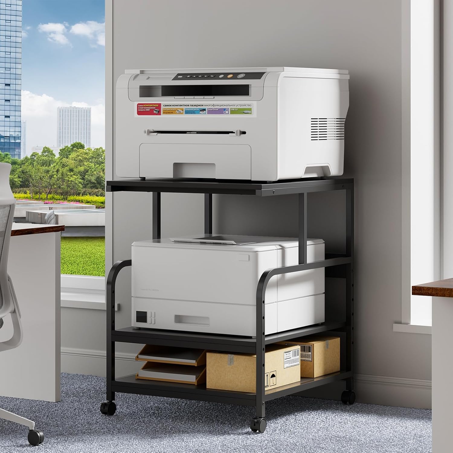 • 【High-Capacity Triple-Tier Design】Store oversized printers, 15+ paper reams, and bulk supplies across three 23.62”W×23.62”D×29.13”H shelves! The open layout offers visibility and airflow, doubling as a printer desk or computer tower stand. Supports 110 lbs/tier—excellent for large printer stands in busy offices. Locking casters prevent drift during use, ensuring reliable home printer stands performance.
