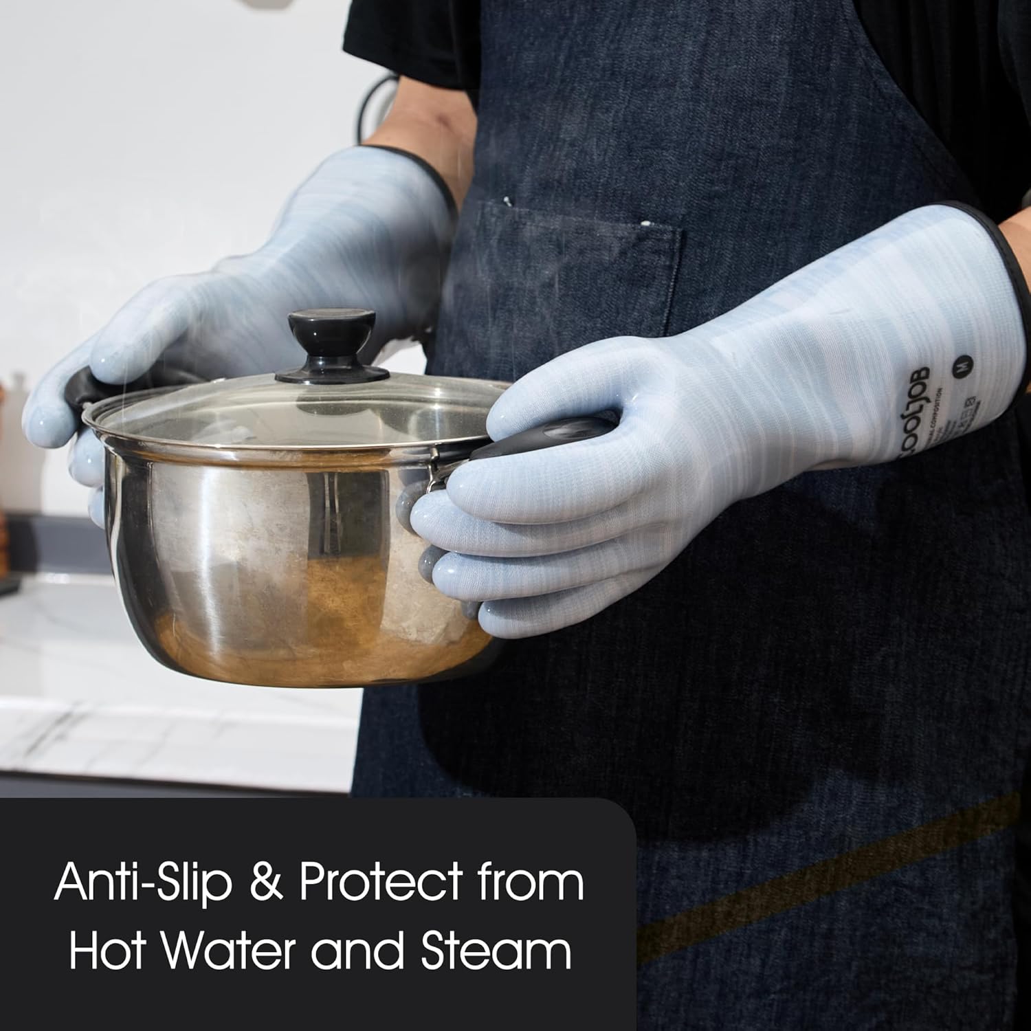 • High Quality Liquid Silicone Gloves: The kitchen gloves are made of Food Grade odorless silicone. With 13-inch sleeve, the gloves provide perfect protection for your hands and arms, defense against hot water and steam.