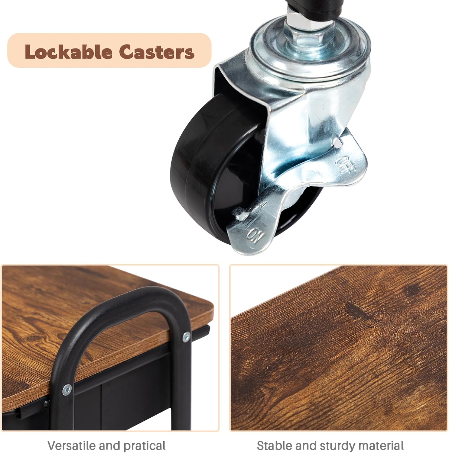 AGTEK Movable Rolling Organizer Cart with Drawer, 3 Tier Metal Utility Cart with Hanging Cups, Drawer with Leather Handle, Mobile Trolley Cart for Home & Office, Black