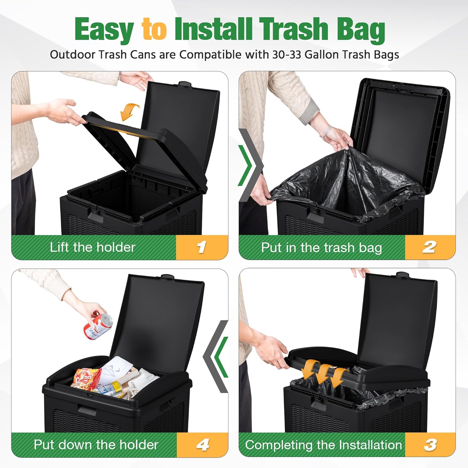 • Easy to Install Trash Bags: The waste bin for outdoors is compatible with 30-33 gallon trash bags. You need to lift the trash bag holder, put on the trash bag, put down the holder, and then finish the installation. After opening the inner lid, the garbage bag can be stably fixed in the card slot.