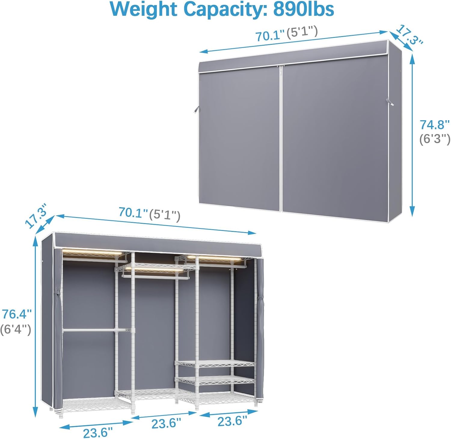 • Dimensions & Load Capacity: 70.1" L x 17.3" W x 76.4" H (includes cover). Load capacity up to 890 lbs. Single hanging rod can support up to 88 lbs, Wire shelf can support up to 90 lbs for each.