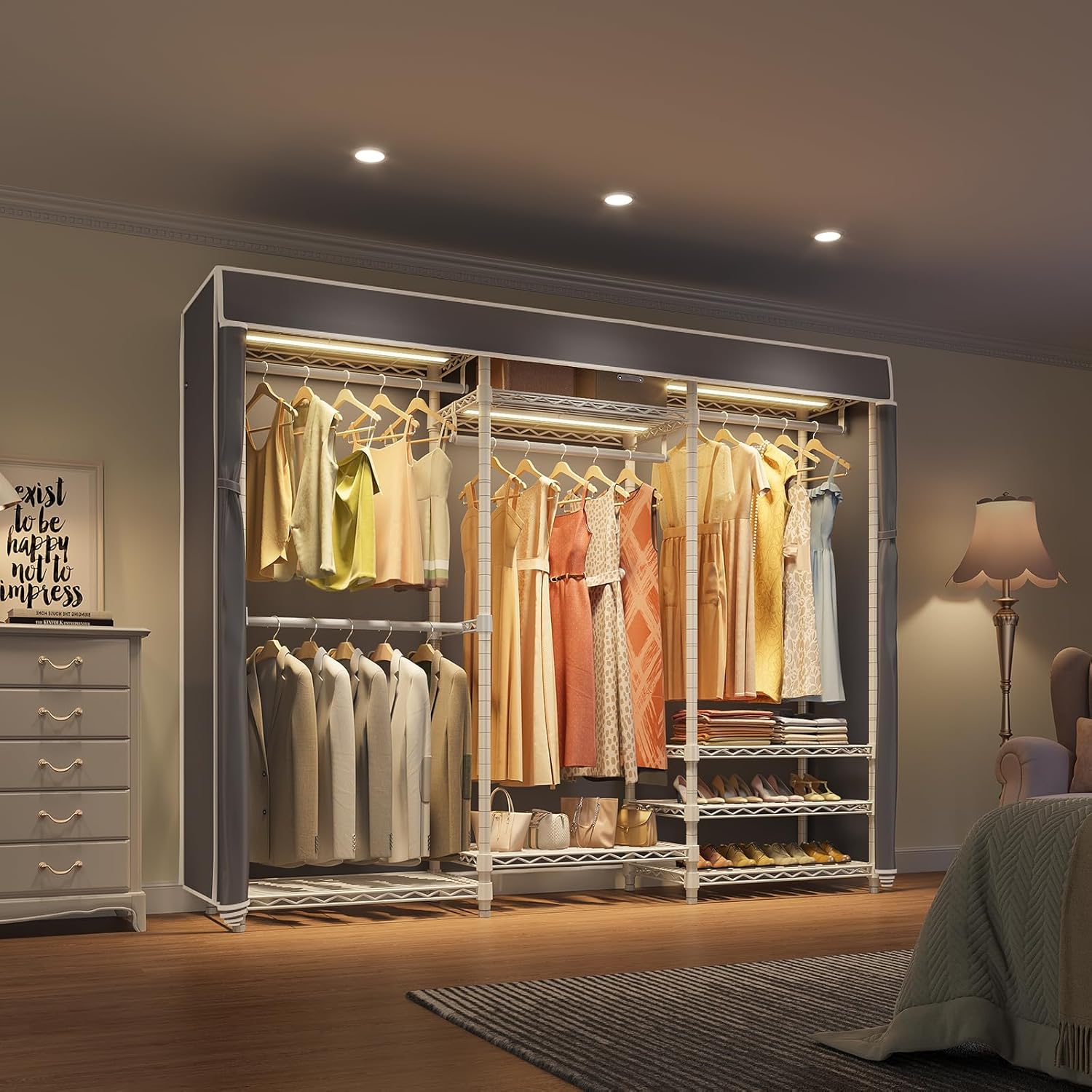 VIPEK V5LC Garment Rack Heavy Duty Covered Clothes Rack with Dimmable LED Lights, 3000K Warm White, Portable Closet Wardrobe Freestanding Clothing Racks for Hanging Clothes, White Rack with Grey Cover