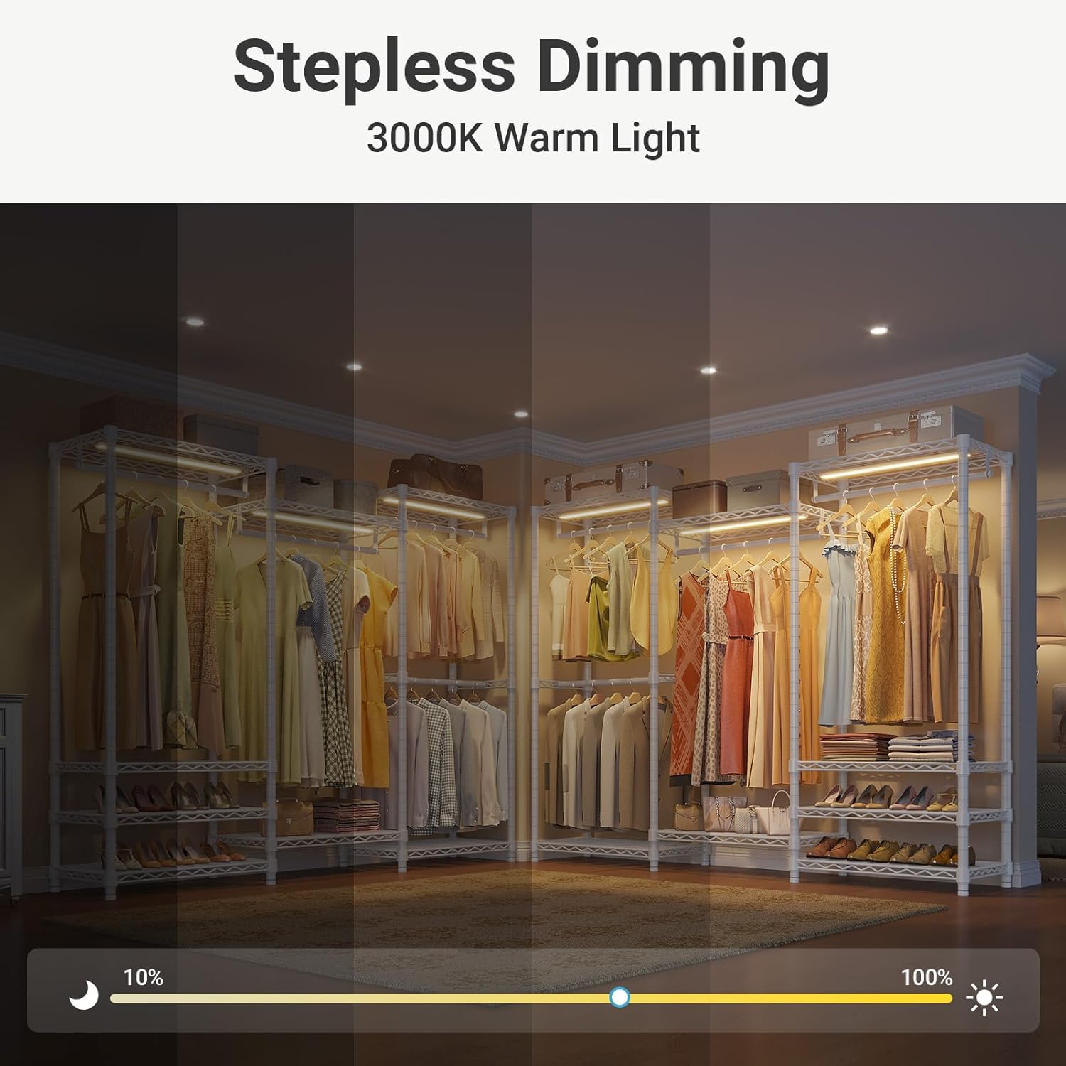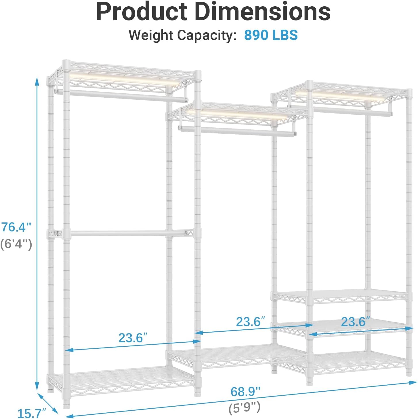 • Easy to Assemble: Our closet rack and lights are easy to assemble with clear instruction. Certain shelves must be installed in a particular order. Except for the manual, you can also refer to the installation video on the page.
