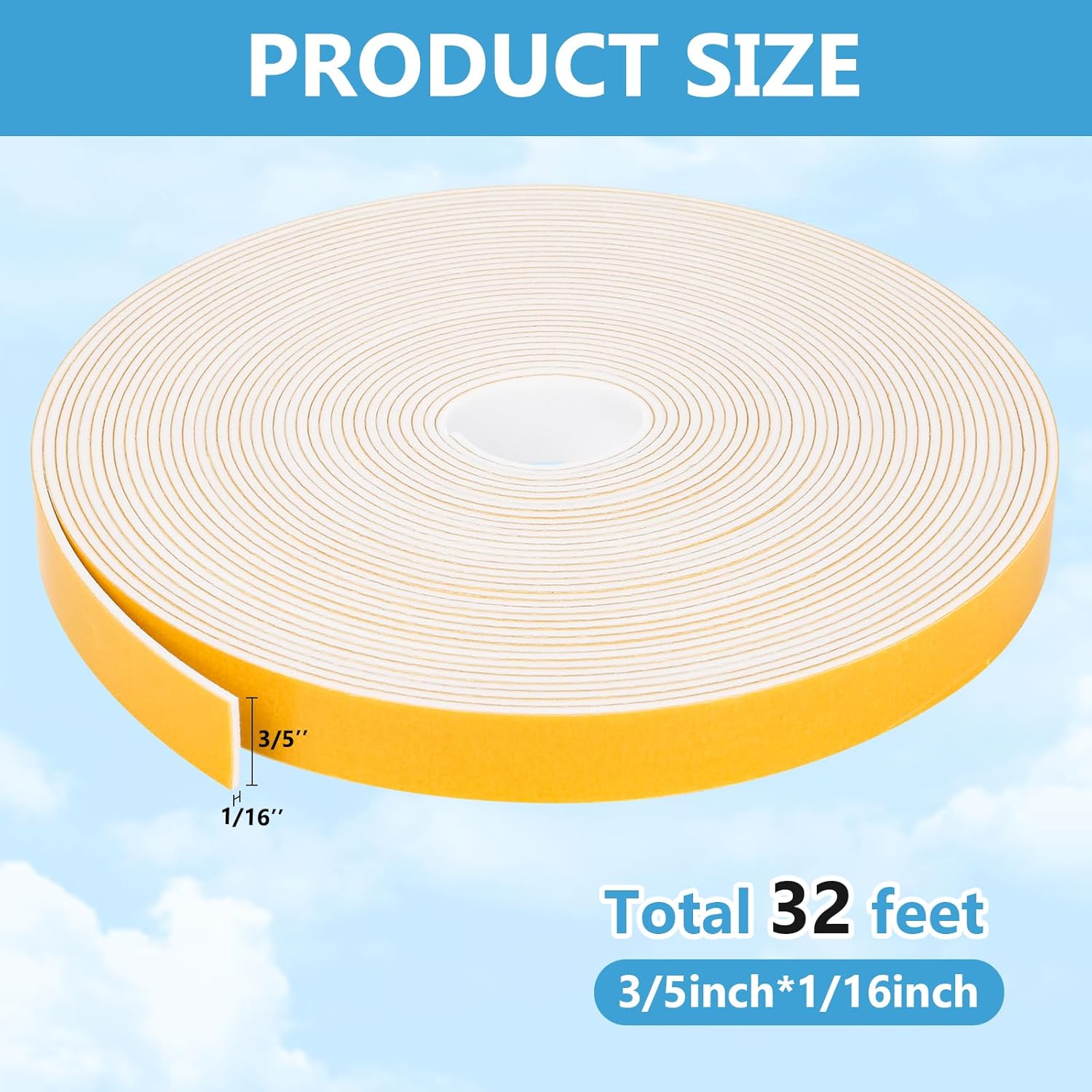 Weather Stripping Door Seal Strip (3/5 Inch X 1/16 Inch X 32Feet), Strong Adhesive, Lightproof, Soundproof, Weatherproof Foam Tape Insulation for Sliding Door, Front Door Frame, Windows- White