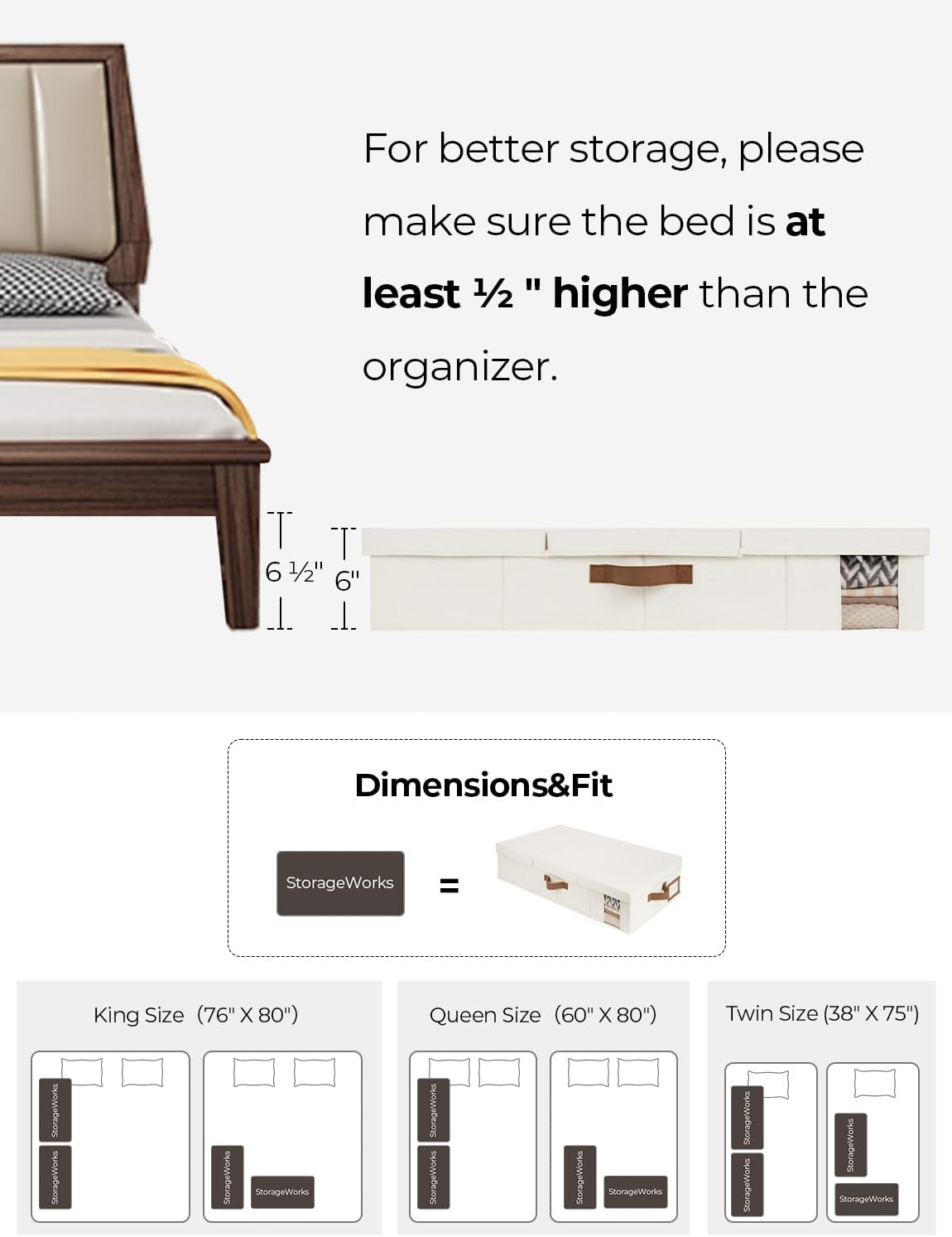 • Large Capacity: With dimensions of 33 x 17 x 6 inches, the under bed storage containers offer ample space for storing a range of items, including clothes, blankets, bedding and shoes, maximizing your underbed storage space and organizing your bedroom. Please make sure that your bed is at least 6.5 inches high for better use.