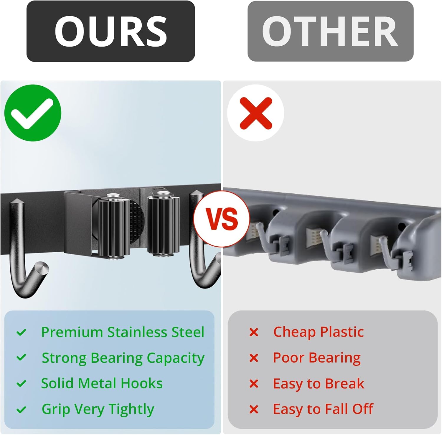 • 🏡【ORGANIZING & SAVING SPACE】Our mop and broom holder wall mount can keep messes organized in just 3 minutes. You can easily mount your broom, mops, rakes, brushes and any other tools, saving space for your kitchen, garage, garden, laundry, closets, bathroom, office, commercial, etc..