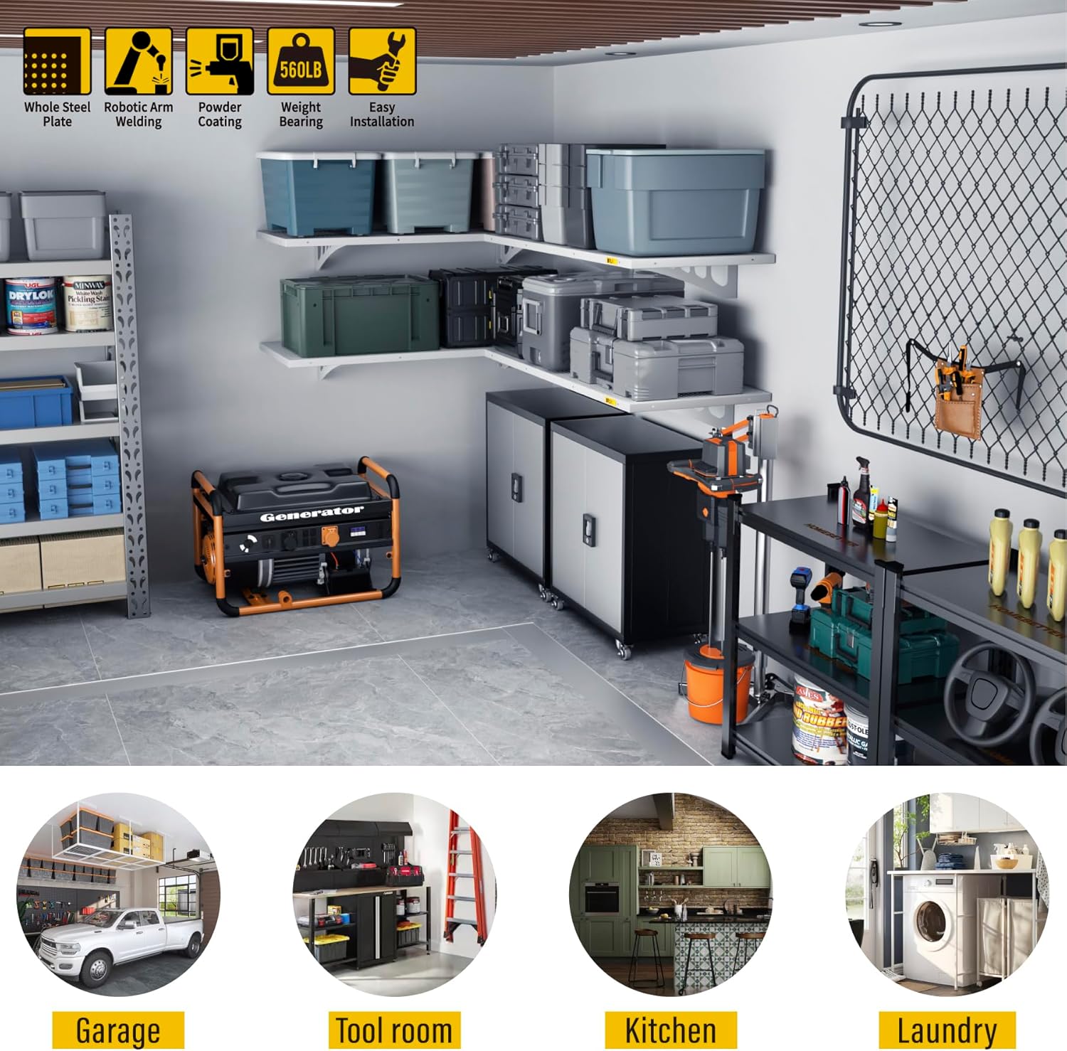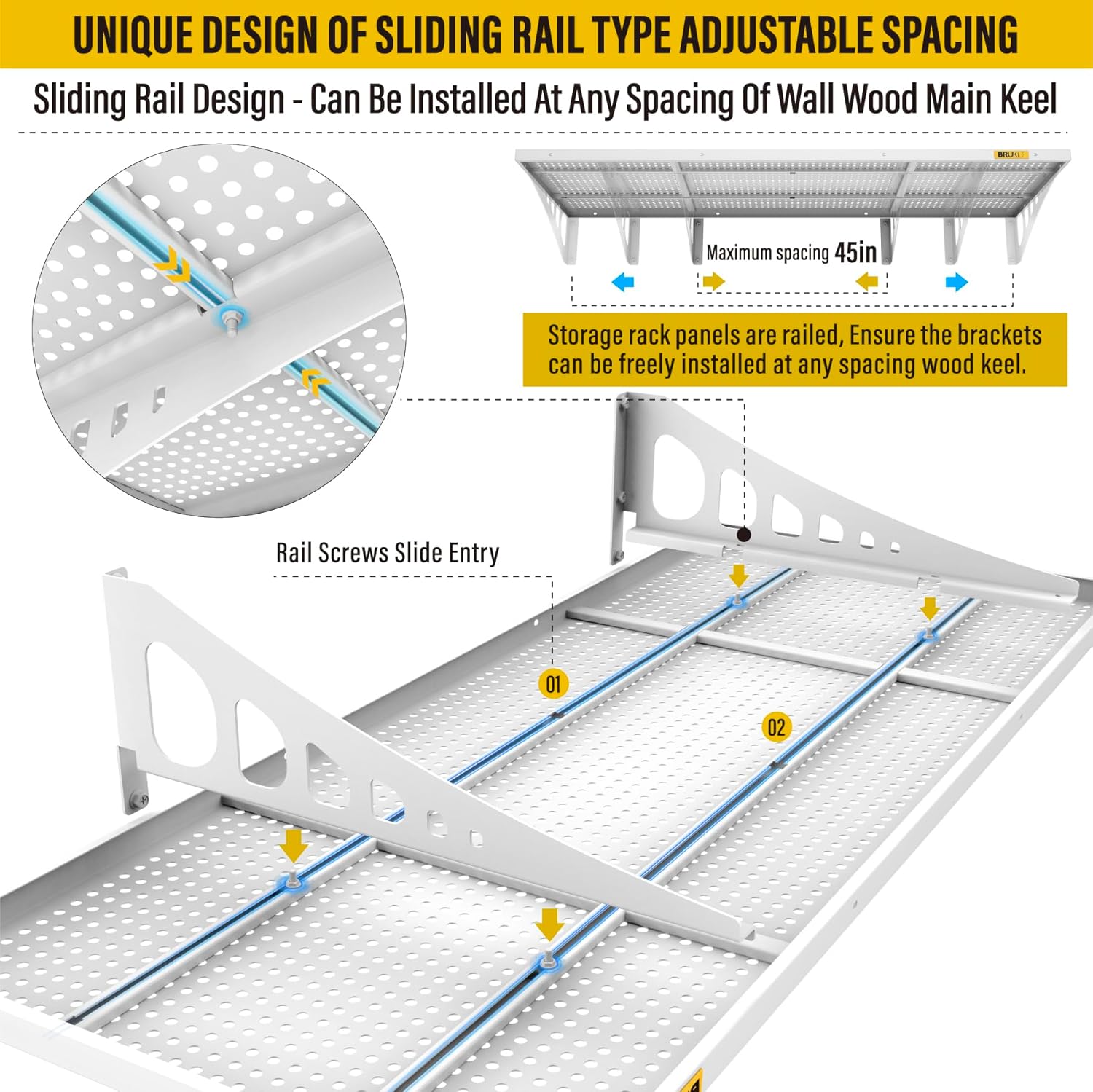 • SUPERIOR DESIGN: Wall shelf garage storage rack panel is made of whole piece of perforated steel plate bending and welding, the surface of matte high temperature powder baking paint, flat and smooth; the panel adopts slide rail design, can be adjusted by parallel left and right sliding at will; bracket can be freely installed in 45” range of the spacing of the wood wall keel, without affecting the precision connection with the panel, eliminating the worry of being unable to docking due to the mismatch of spacing points of load-bearing wood wall keel or inaccuracy of the installation of the bracket. It saves time and labor