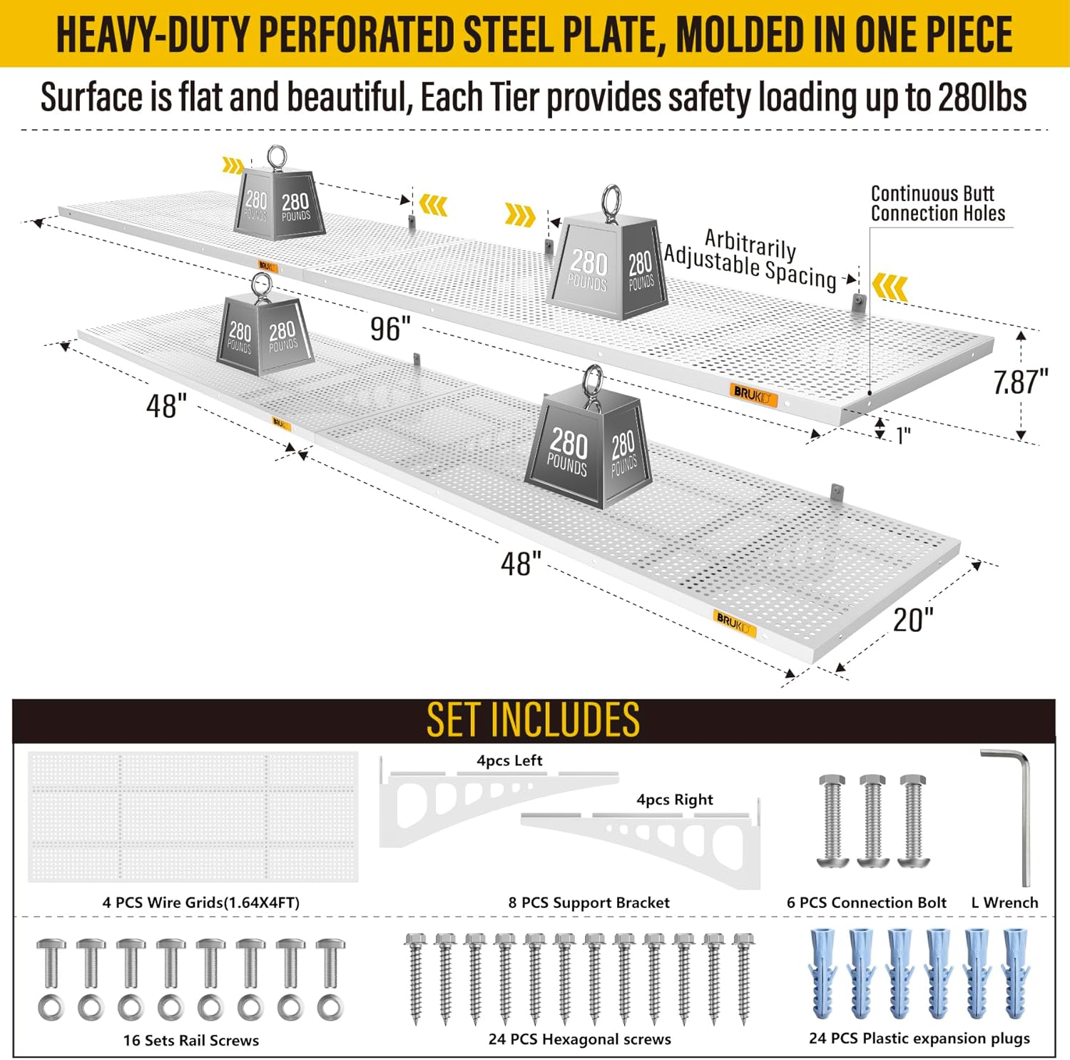 • KIT INCLUDES: Includes 4pcs of face plate; 8 Brackets; 24 Hexagonal screws (Hardened ∅0.2" L/2"); 24 plastic expansion plugs, 16 Sets of rail attachment bolts; 1 L-wrench; 1 installation manual. All the hardware of Brukid professional series wall mounted shelves are under strict quality control and testing, we strive to provide our customers with a quality shopping experience, when you receive the product encountered any problems, please contact us at the first time, we will certainly give you a satisfactory solution