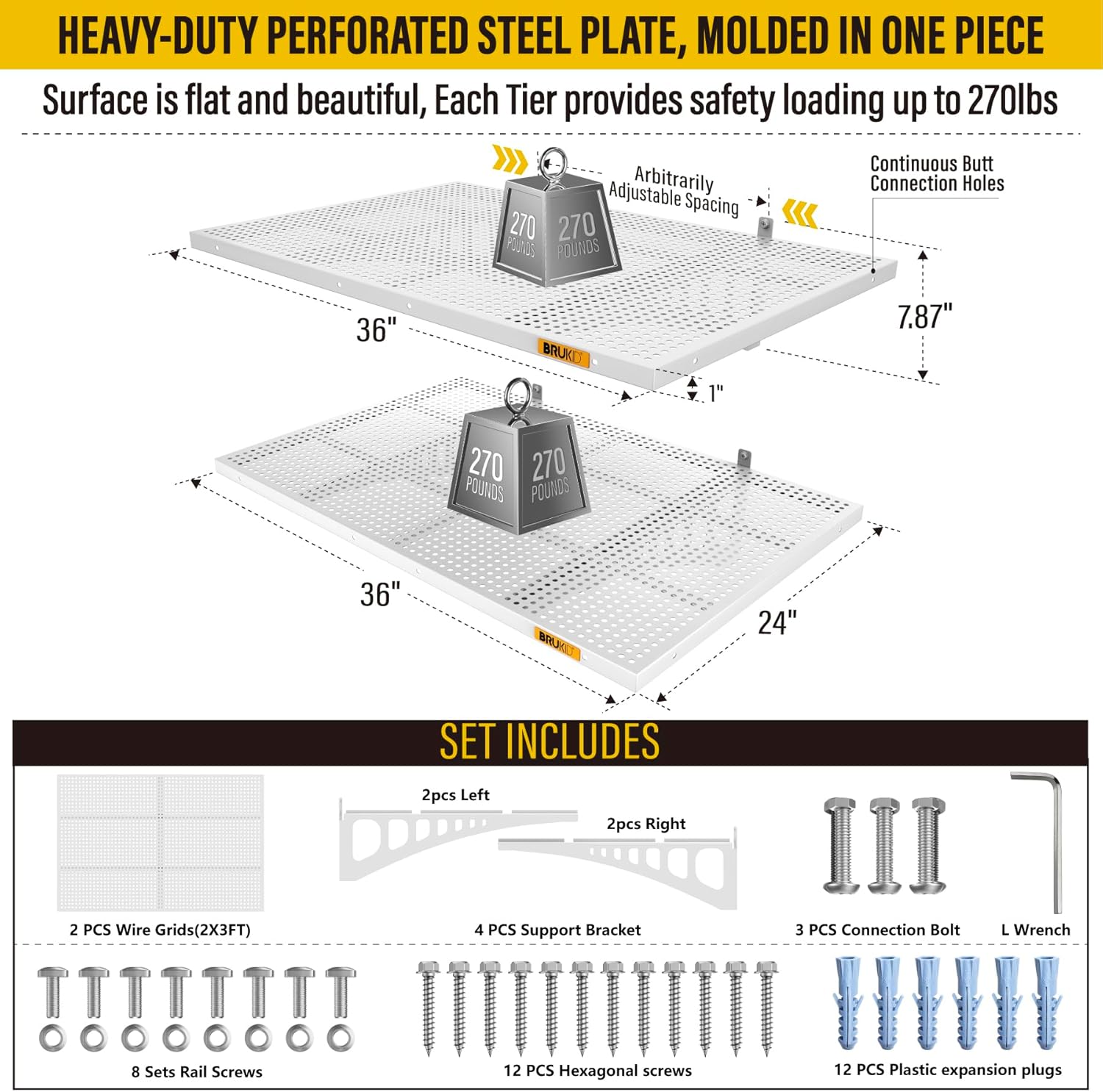• SUPERIOR DESIGN: Wall shelf garage storage rack panel is made of whole piece of perforated steel plate bending and welding, the surface of matte high temperature powder baking paint, flat and smooth; the panel adopts slide rail design, can be adjusted by parallel left and right sliding at will; bracket can be freely installed in 33” range of the spacing of the wood wall keel, without affecting the precision connection with the panel, eliminating the worry of being unable to docking due to the mismatch of spacing points of load-bearing wood wall keel or inaccuracy of the installation of the bracket. It saves time and labor
